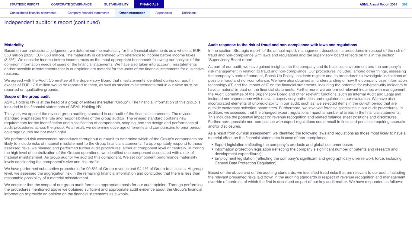 Materiality Based on our professional judgement we determined the materiality for the financial statements as a whole at EUR 350 million (2023: EUR 350 million). The materiality is determined with reference to income before income taxes (3.5%). We consider income before income taxes as the most appropriate benchmark following our analysis of the common information needs of users of the financial statements. We have also taken into account misstatements and/or possible misstatements that in our opinion are material for the users of the financial statements for qualitative reasons. We agreed with the Audit Committee of the Supervisory Board that misstatements identified during our audit in excess of EUR 17.5 million would be reported to them, as well as smaller misstatements that in our view must be reported on qualitative grounds. Scope of the group audit ASML Holding NV is at the head of a group of entities (hereafter “Group”). The financial information of this group is included in the financial statements of ASML Holding NV. This year, we applied the revised group auditing standard in our audit of the financial statements. The revised standard emphasizes the role and responsibilities of the group auditor. The revised standard contains new requirements for the identification and classification of components, scoping, and the design and performance of audit procedures across the group. As a result, we determine coverage differently and comparisons to prior period coverage figures are not meaningful. We performed risk assessment procedures throughout our audit to determine which of the Group’s components are likely to include risks of material misstatement to the Group financial statements. To appropriately respond to those assessed risks, we planned and performed further audit procedures, either at component level or centrally. Mirroring the high level of centralization of the Groups operations, we identified one component associated with a risk of material misstatement. As group auditor we audited this component. We set component performance materiality levels considering the component’s size and risk profile. We have performed substantive procedures for 99.6% of Group revenue and 94.1% of Group total assets. At group level, we assessed the aggregation risk in the remaining financial information and concluded that there is less than reasonable possibility of a material misstatement. We consider that the scope of our group audit forms an appropriate basis for our audit opinion. Through performing the procedures mentioned above we obtained sufficient and appropriate audit evidence about the Group’s financial information to provide an opinion on the financial statements as a whole. Audit response to the risk of fraud and non-compliance with laws and regulations In the section ‘Strategic report’ of the annual report, management describes its procedures in respect of the risk of fraud and non-compliance with laws and regulations and the supervisory board reflects on this in the section ‘Supervisory Board report’. As part of our audit, we have gained insights into the company and its business environment and the company’s risk management in relation to fraud and non-compliance. Our procedures included, among other things, assessing the company’s code of conduct, Speak Up Policy, incidents register and its procedures to investigate indications of possible fraud and non-compliance. We have also obtained an understanding of how the company uses information technology (IT) and the impact of IT on the financial statements, including the potential for cybersecurity incidents to have a material impact on the financial statements. Furthermore, we performed relevant inquiries with management, the Audit Committee of the Supervisory Board and other relevant functions, such as Internal Audit and Legal and included correspondence with relevant supervisory authorities and regulators in our evaluation. We have also incorporated elements of unpredictability in our audit, such as: we selected items in the cut-off period that are outside customary selection parameters. Furthermore, we involved forensic specialists in our audit procedures. In addition, we assessed that the changed export regulations impact a number of areas in the financial statements. This includes the potential impact on revenue recognition and related balance sheet positions and disclosures. Furthermore, possible non-compliance with export regulations could result in fines and penalties requiring accruals and/or disclosures. As a result from our risk assessment, we identified the following laws and regulations as those most likely to have a material effect on the financial statements in case of non-compliance: • Export legislation (reflecting the company’s products and global customer base); • Information protection legislation (reflecting the company’s significant number of patents and research and development expenditures); • Employment legislation (reflecting the company’s significant and geographically diverse work force, including General Data Protection Regulation). Based on the above and on the auditing standards, we identified fraud risks that are relevant to our audit, including the relevant presumed risks laid down in the auditing standards in respect of revenue recognition and management override of controls, of which the first is described as part of our key audit matter. We have responded as follows: STRATEGIC REPORT CORPORATE GOVERNANCE SUSTAINABILITY FINANCIALS ASML Annual Report 2024 398 Consolidated financial statements Company financial statements Other information Appendices Definitions Independent auditor's report (continued)