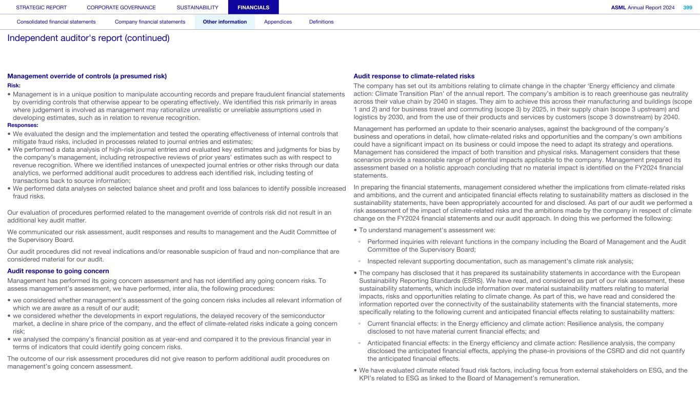 Management override of controls (a presumed risk) Risk: • Management is in a unique position to manipulate accounting records and prepare fraudulent financial statements by overriding controls that otherwise appear to be operating effectively. We identified this risk primarily in areas where judgement is involved as management may rationalize unrealistic or unreliable assumptions used in developing estimates, such as in relation to revenue recognition. Responses: • We evaluated the design and the implementation and tested the operating effectiveness of internal controls that mitigate fraud risks, included in processes related to journal entries and estimates; • We performed a data analysis of high-risk journal entries and evaluated key estimates and judgments for bias by the company’s management, including retrospective reviews of prior years’ estimates such as with respect to revenue recognition. Where we identified instances of unexpected journal entries or other risks through our data analytics, we performed additional audit procedures to address each identified risk, including testing of transactions back to source information; • We performed data analyses on selected balance sheet and profit and loss balances to identify possible increased fraud risks. Our evaluation of procedures performed related to the management override of controls risk did not result in an additional key audit matter. We communicated our risk assessment, audit responses and results to management and the Audit Committee of the Supervisory Board. Our audit procedures did not reveal indications and/or reasonable suspicion of fraud and non-compliance that are considered material for our audit. Audit response to going concern Management has performed its going concern assessment and has not identified any going concern risks. To assess management’s assessment, we have performed, inter alia, the following procedures: • we considered whether management’s assessment of the going concern risks includes all relevant information of which we are aware as a result of our audit; • we considered whether the developments in export regulations, the delayed recovery of the semiconductor market, a decline in share price of the company, and the effect of climate-related risks indicate a going concern risk; • we analysed the company’s financial position as at year-end and compared it to the previous financial year in terms of indicators that could identify going concern risks. The outcome of our risk assessment procedures did not give reason to perform additional audit procedures on management’s going concern assessment. Audit response to climate-related risks The company has set out its ambitions relating to climate change in the chapter ‘Energy efficiency and climate action: Climate Transition Plan’ of the annual report. The company’s ambition is to reach greenhouse gas neutrality across their value chain by 2040 in stages. They aim to achieve this across their manufacturing and buildings (scope 1 and 2) and for business travel and commuting (scope 3) by 2025, in their supply chain (scope 3 upstream) and logistics by 2030, and from the use of their products and services by customers (scope 3 downstream) by 2040. Management has performed an update to their scenario analyses, against the background of the company’s business and operations in detail, how climate-related risks and opportunities and the company’s own ambitions could have a significant impact on its business or could impose the need to adapt its strategy and operations. Management has considered the impact of both transition and physical risks. Management considers that these scenarios provide a reasonable range of potential impacts applicable to the company. Management prepared its assessment based on a holistic approach concluding that no material impact is identified on the FY2024 financial statements. In preparing the financial statements, management considered whether the implications from climate-related risks and ambitions, and the current and anticipated financial effects relating to sustainability matters as disclosed in the sustainability statements, have been appropriately accounted for and disclosed. As part of our audit we performed a risk assessment of the impact of climate-related risks and the ambitions made by the company in respect of climate change on the FY2024 financial statements and our audit approach. In doing this we performed the following: • To understand management's assessment we: ◦ Performed inquiries with relevant functions in the company including the Board of Management and the Audit Committee of the Supervisory Board; ◦ Inspected relevant supporting documentation, such as management’s climate risk analysis; • The company has disclosed that it has prepared its sustainability statements in accordance with the European Sustainability Reporting Standards (ESRS). We have read, and considered as part of our risk assessment, these sustainability statements, which include information over material sustainability matters relating to material impacts, risks and opportunities relating to climate change. As part of this, we have read and considered the information reported over the connectivity of the sustainability statements with the financial statements, more specifically relating to the following current and anticipated financial effects relating to sustainability matters: ◦ Current financial effects: in the Energy efficiency and climate action: Resilience analysis, the company disclosed to not have material current financial effects; and ◦ Anticipated financial effects: in the Energy efficiency and climate action: Resilience analysis, the company disclosed the anticipated financial effects, applying the phase-in provisions of the CSRD and did not quantify the anticipated financial effects. • We have evaluated climate related fraud risk factors, including focus from external stakeholders on 