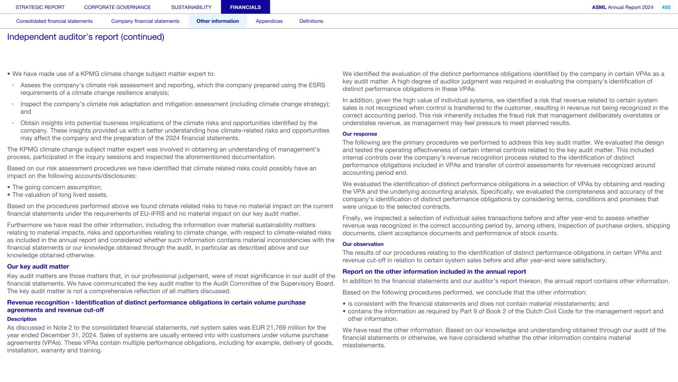 • We have made use of a KPMG climate change subject matter expert to: ◦ Assess the company’s climate risk assessment and reporting, which the company prepared using the ESRS requirements of a climate change resilience analysis; ◦ Inspect the company’s climate risk adaptation and mitigation assessment (including climate change strategy); and ◦ Obtain insights into potential business implications of the climate risks and opportunities identified by the company. These insights provided us with a better understanding how climate-related risks and opportunities may affect the company and the preparation of the 2024 financial statements. The KPMG climate change subject matter expert was involved in obtaining an understanding of management’s process, participated in the inquiry sessions and inspected the aforementioned documentation. Based on our risk assessment procedures we have identified that climate related risks could possibly have an impact on the following accounts/disclosures: • The going concern assumption; • The valuation of long lived assets. Based on the procedures performed above we found climate related risks to have no material impact on the current financial statements under the requirements of EU-IFRS and no material impact on our key audit matter. Furthermore we have read the other information, including the information over material sustainability matters relating to material impacts, risks and opportunities relating to climate change, with respect to climate-related risks as included in the annual report and considered whether such information contains material inconsistencies with the financial statements or our knowledge obtained through the audit, in particular as described above and our knowledge obtained otherwise. Our key audit matter Key audit matters are those matters that, in our professional judgement, were of most significance in our audit of the financial statements. We have communicated the key audit matter to the Audit Committee of the Supervisory Board. The key audit matter is not a comprehensive reflection of all matters discussed. Revenue recognition - Identification of distinct performance obligations in certain volume purchase agreements and revenue cut-off Description As discussed in Note 2 to the consolidated financial statements, net system sales was EUR 21,769 million for the year ended December 31, 2024. Sales of systems are usually entered into with customers under volume purchase agreements (VPAs). These VPAs contain multiple performance obligations, including for example, delivery of goods, installation, warranty and training. We identified the evaluation of the distinct performance obligations identified by the company in certain VPAs as a key audit matter. A high degree of auditor judgment was required in evaluating the company’s identification of distinct performance obligations in these VPAs. In addition, given the high value of individual systems, we identified a risk that revenue related to certain system sales is not recognized when control is transferred to the customer, resulting in revenue not being recognized in the correct accounting period. This risk inherently includes the fraud risk that management deliberately overstates or understates revenue, as management may feel pressure to meet planned results. Our response The following are the primary procedures we performed to address this key audit matter. We evaluated the design and tested the operating effectiveness of certain internal controls related to the key audit matter. This included internal controls over the company’s revenue recognition process related to the identification of distinct performance obligations included in VPAs and transfer of control assessments for revenues recognized around accounting period end. We evaluated the identification of distinct performance obligations in a selection of VPAs by obtaining and reading the VPA and the underlying accounting analysis. Specifically, we evaluated the completeness and accuracy of the company’s identification of distinct performance obligations by considering terms, conditions and promises that were unique to the selected contracts. Finally, we inspected a selection of individual sales transactions before and after year-end to assess whether revenue was recognized in the correct accounting period by, among others, inspection of purchase orders, shipping documents, client acceptance documents and performance of stock counts. Our observation The results of our procedures relating to the identification of distinct performance obligations in certain VPAs and revenue cut-off in relation to certain system sales before and after year-end were satisfactory. Report on the other information included in the annual report In addition to the financial statements and our auditor’s report thereon, the annual report contains other information. Based on the following procedures performed, we conclude that the other information: • is consistent with the financial statements and does not contain material misstatements; and • contains the information as required by Part 9 of Book 2 of the Dutch Civil Code for the management report and other information. We have read the other information. Based on our knowledge and understanding obtained through our audit of the financial statements or otherwise, we have considered whether the other information contains material misstatements. STRATEGIC REPORT CORPORATE GOVERNANCE SUSTAINABILITY FINANCIALS ASML Annual Report 2024 400 Consolidated financial statements Company financial statements Other information Appendices Definitions Independent auditor's report (continued)