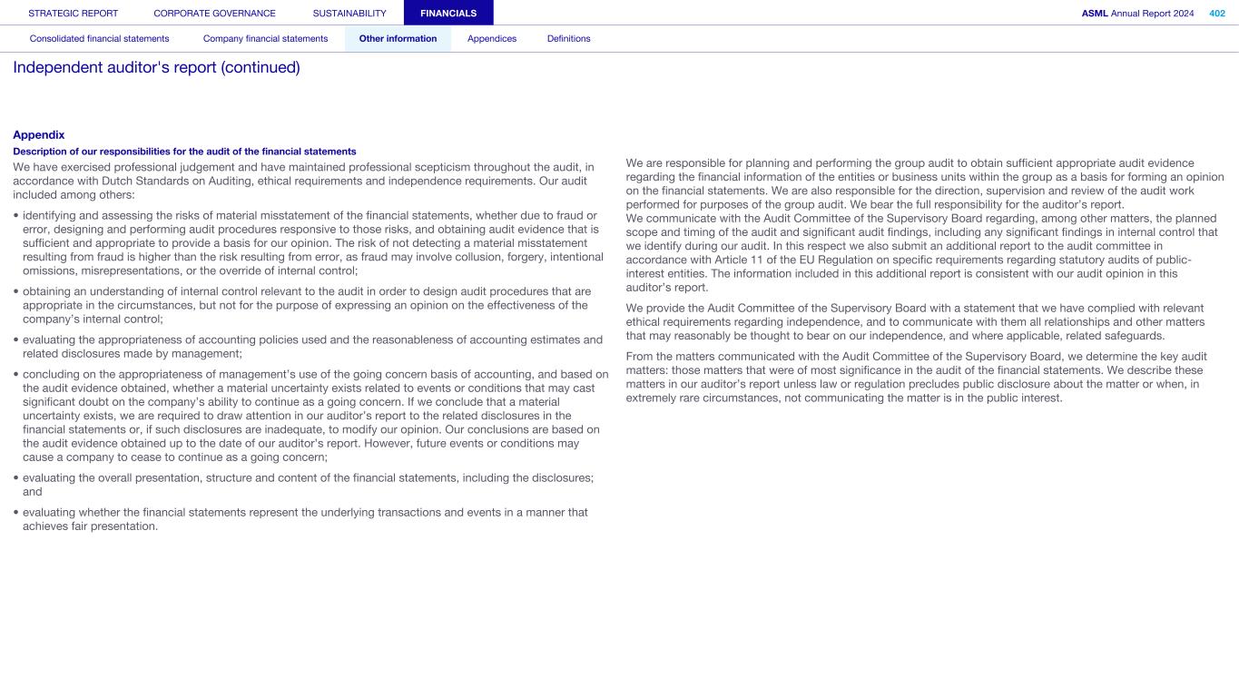 Appendix Description of our responsibilities for the audit of the financial statements We have exercised professional judgement and have maintained professional scepticism throughout the audit, in accordance with Dutch Standards on Auditing, ethical requirements and independence requirements. Our audit included among others: • identifying and assessing the risks of material misstatement of the financial statements, whether due to fraud or error, designing and performing audit procedures responsive to those risks, and obtaining audit evidence that is sufficient and appropriate to provide a basis for our opinion. The risk of not detecting a material misstatement resulting from fraud is higher than the risk resulting from error, as fraud may involve collusion, forgery, intentional omissions, misrepresentations, or the override of internal control; • obtaining an understanding of internal control relevant to the audit in order to design audit procedures that are appropriate in the circumstances, but not for the purpose of expressing an opinion on the effectiveness of the company’s internal control; • evaluating the appropriateness of accounting policies used and the reasonableness of accounting estimates and related disclosures made by management; • concluding on the appropriateness of management’s use of the going concern basis of accounting, and based on the audit evidence obtained, whether a material uncertainty exists related to events or conditions that may cast significant doubt on the company’s ability to continue as a going concern. If we conclude that a material uncertainty exists, we are required to draw attention in our auditor’s report to the related disclosures in the financial statements or, if such disclosures are inadequate, to modify our opinion. Our conclusions are based on the audit evidence obtained up to the date of our auditor’s report. However, future events or conditions may cause a company to cease to continue as a going concern; • evaluating the overall presentation, structure and content of the financial statements, including the disclosures; and • evaluating whether the financial statements represent the underlying transactions and events in a manner that achieves fair presentation. We are responsible for planning and performing the group audit to obtain sufficient appropriate audit evidence regarding the financial information of the entities or business units within the group as a basis for forming an opinion on the financial statements. We are also responsible for the direction, supervision and review of the audit work performed for purposes of the group audit. We bear the full responsibility for the auditor’s report. We communicate with the Audit Committee of the Supervisory Board regarding, among other matters, the planned scope and timing of the audit and significant audit findings, including any significant findings in internal control that we identify during our audit. In this respect we also submit an additional report to the audit committee in accordance with Article 11 of the EU Regulation on specific requirements regarding statutory audits of public- interest entities. The information included in this additional report is consistent with our audit opinion in this auditor’s report. We provide the Audit Committee of the Supervisory Board with a statement that we have complied with relevant ethical requirements regarding independence, and to communicate with them all relationships and other matters that may reasonably be thought to bear on our independence, and where applicable, related safeguards. From the matters communicated with the Audit Committee of the Supervisory Board, we determine the key audit matters: those matters that were of most significance in the audit of the financial statements. We describe these matters in our auditor’s report unless law or regulation precludes public disclosure about the matter or when, in extremely rare circumstances, not communicating the matter is in the public interest. STRATEGIC REPORT CORPORATE GOVERNANCE SUSTAINABILITY FINANCIALS ASML Annual Report 2024 402 Consolidated financial statements Company financial statements Other information Appendices Definitions Independent auditor's report (continued)
