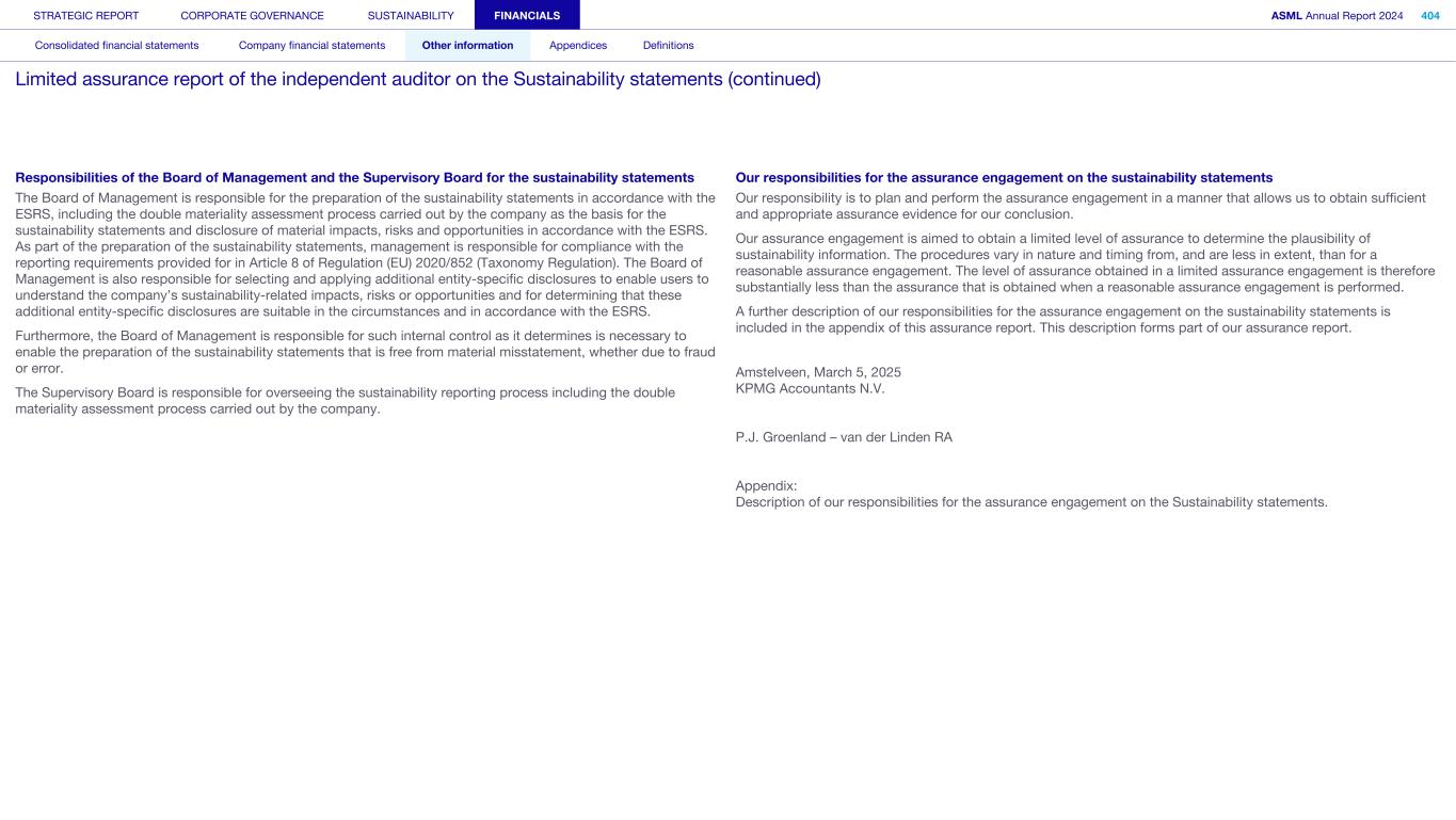 Responsibilities of the Board of Management and the Supervisory Board for the sustainability statements The Board of Management is responsible for the preparation of the sustainability statements in accordance with the ESRS, including the double materiality assessment process carried out by the company as the basis for the sustainability statements and disclosure of material impacts, risks and opportunities in accordance with the ESRS. As part of the preparation of the sustainability statements, management is responsible for compliance with the reporting requirements provided for in Article 8 of Regulation (EU) 2020/852 (Taxonomy Regulation). The Board of Management is also responsible for selecting and applying additional entity-specific disclosures to enable users to understand the company’s sustainability-related impacts, risks or opportunities and for determining that these additional entity-specific disclosures are suitable in the circumstances and in accordance with the ESRS. Furthermore, the Board of Management is responsible for such internal control as it determines is necessary to enable the preparation of the sustainability statements that is free from material misstatement, whether due to fraud or error. The Supervisory Board is responsible for overseeing the sustainability reporting process including the double materiality assessment process carried out by the company. Our responsibilities for the assurance engagement on the sustainability statements Our responsibility is to plan and perform the assurance engagement in a manner that allows us to obtain sufficient and appropriate assurance evidence for our conclusion. Our assurance engagement is aimed to obtain a limited level of assurance to determine the plausibility of sustainability information. The procedures vary in nature and timing from, and are less in extent, than for a reasonable assurance engagement. The level of assurance obtained in a limited assurance engagement is therefore substantially less than the assurance that is obtained when a reasonable assurance engagement is performed. A further description of our responsibilities for the assurance engagement on the sustainability statements is included in the appendix of this assurance report. This description forms part of our assurance report. Amstelveen, March 5, 2025 KPMG Accountants N.V. P.J. Groenland – van der Linden RA Appendix: Description of our responsibilities for the assurance engagement on the Sustainability statements. STRATEGIC REPORT CORPORATE GOVERNANCE SUSTAINABILITY FINANCIALS ASML Annual Report 2024 404 Consolidated financial statements Company financial statements Other information Appendices Definitions Limited assurance report of the independent auditor on the Sustainability statements (continued)