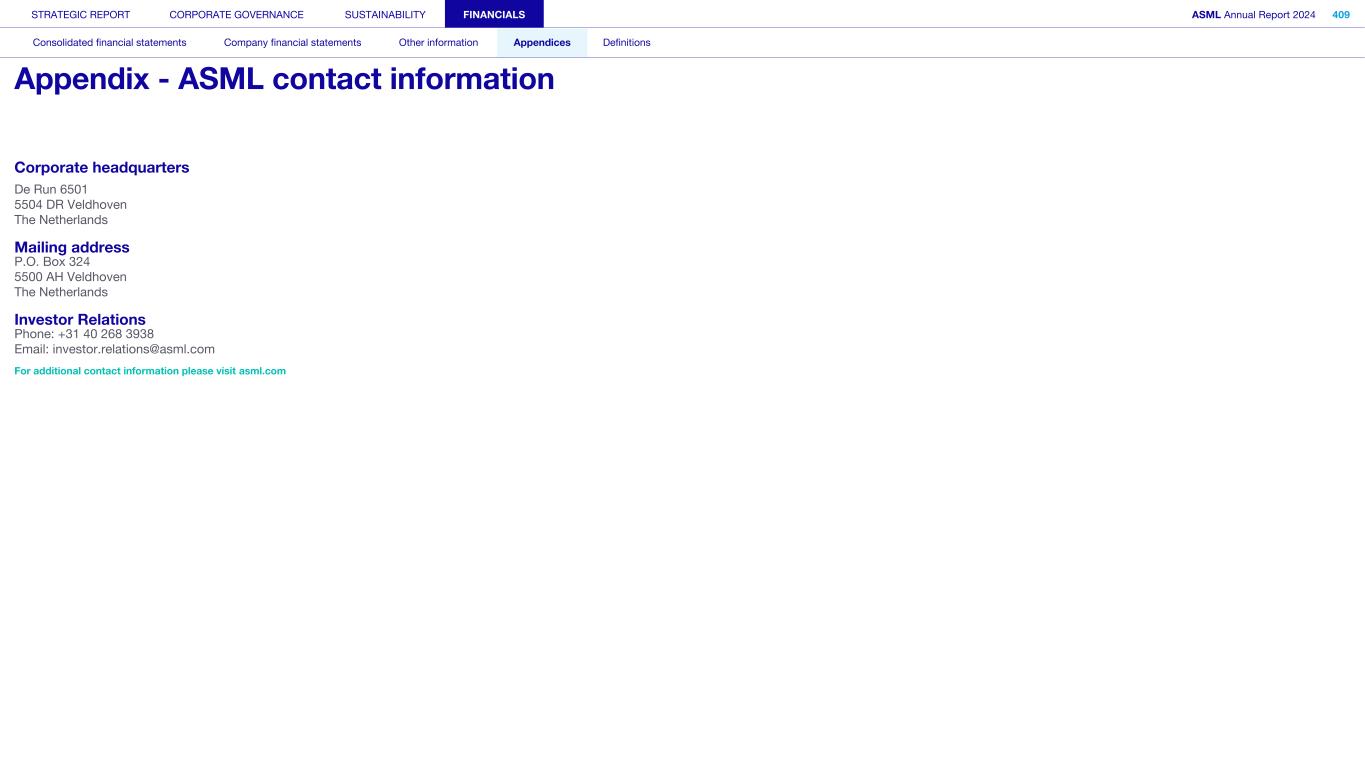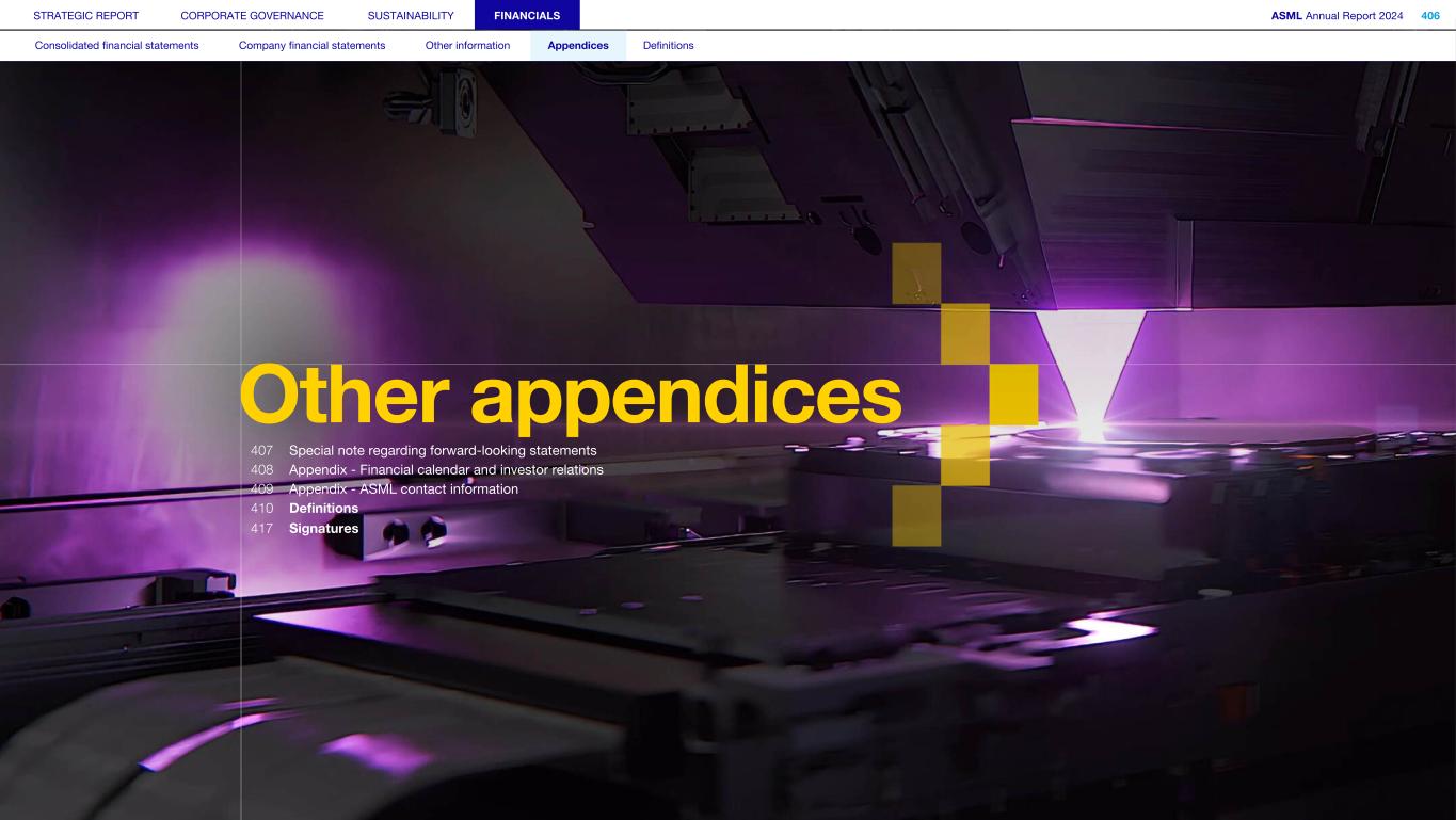 x STRATEGIC REPORT CORPORATE GOVERNANCE SUSTAINABILITY FINANCIALS ASML Annual Report 2024 406 Consolidated financial statements Company financial statements Other information Appendices Definitions Other appendices 407 Special note regarding forward-looking statements 408 Appendix - Financial calendar and investor relations 409 Appendix - ASML contact information 410 Definitions 417 Signatures