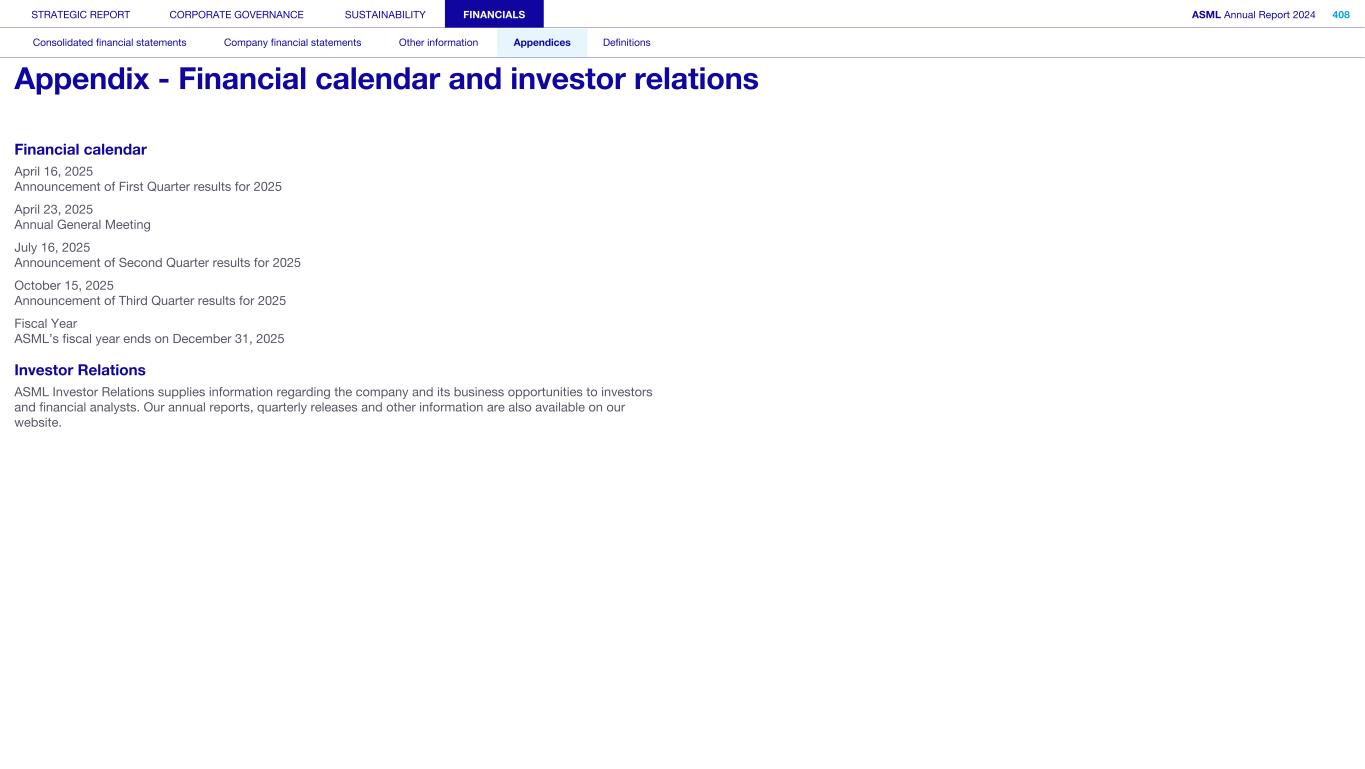Financial calendar April 16, 2025 Announcement of First Quarter results for 2025 April 23, 2025 Annual General Meeting July 16, 2025 Announcement of Second Quarter results for 2025 October 15, 2025 Announcement of Third Quarter results for 2025 Fiscal Year ASML’s fiscal year ends on December 31, 2025 Investor Relations ASML Investor Relations supplies information regarding the company and its business opportunities to investors and financial analysts. Our annual reports, quarterly releases and other information are also available on our website. STRATEGIC REPORT CORPORATE GOVERNANCE SUSTAINABILITY FINANCIALS ASML Annual Report 2024 408 Consolidated financial statements Company financial statements Other information Appendices Definitions Appendix - Financial calendar and investor relations