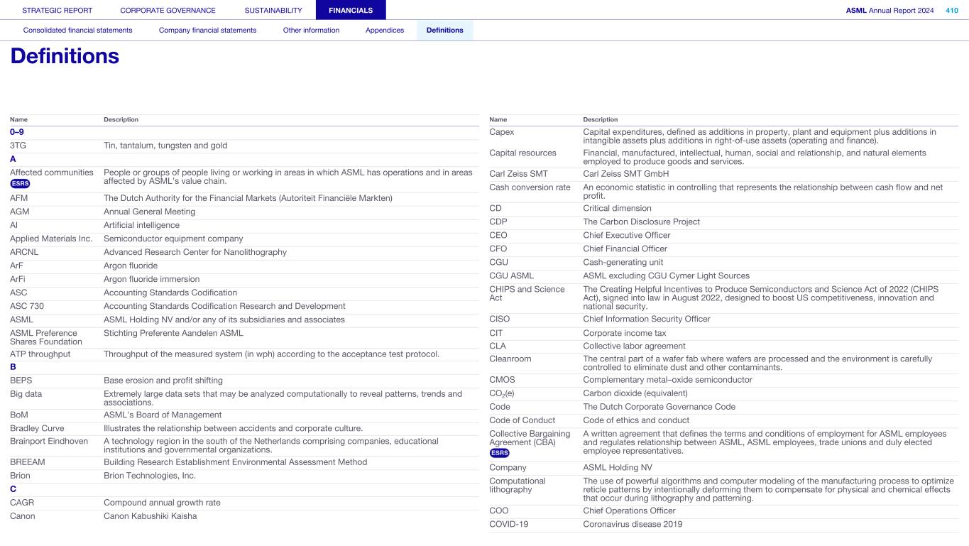 0–9 3TG Tin, tantalum, tungsten and gold A Affected communities People or groups of people living or working in areas in which ASML has operations and in areas affected by ASML’s value chain. AFM The Dutch Authority for the Financial Markets (Autoriteit Financiële Markten) AGM Annual General Meeting AI Artificial intelligence Applied Materials Inc. Semiconductor equipment company ARCNL Advanced Research Center for Nanolithography ArF Argon fluoride ArFi Argon fluoride immersion ASC Accounting Standards Codification ASC 730 Accounting Standards Codification Research and Development ASML ASML Holding NV and/or any of its subsidiaries and associates ASML Preference Shares Foundation Stichting Preferente Aandelen ASML ATP throughput Throughput of the measured system (in wph) according to the acceptance test protocol. B BEPS Base erosion and profit shifting Big data Extremely large data sets that may be analyzed computationally to reveal patterns, trends and associations. BoM ASML's Board of Management Bradley Curve Illustrates the relationship between accidents and corporate culture. Brainport Eindhoven A technology region in the south of the Netherlands comprising companies, educational institutions and governmental organizations. BREEAM Building Research Establishment Environmental Assessment Method Brion Brion Technologies, Inc. C CAGR Compound annual growth rate Canon Canon Kabushiki Kaisha Name Description Capex Capital expenditures, defined as additions in property, plant and equipment plus additions in intangible assets plus additions in right-of-use assets (operating and finance). Capital resources Financial, manufactured, intellectual, human, social and relationship, and natural elements employed to produce goods and services. Carl Zeiss SMT Carl Zeiss SMT GmbH Cash conversion rate An economic statistic in controlling that represents the relationship between cash flow and net profit. CD Critical dimension CDP The Carbon Disclosure Project CEO Chief Executive Officer CFO Chief Financial Officer CGU Cash-generating unit CGU ASML ASML excluding CGU Cymer Light Sources CHIPS and Science Act The Creating Helpful Incentives to Produce Semiconductors and Science Act of 2022 (CHIPS Act), signed into law in August 2022, designed to boost US competitiveness, innovation and national security. CISO Chief Information Security Officer CIT Corporate income tax CLA Collective labor agreement Cleanroom The central part of a wafer fab where wafers are processed and the environment is carefully controlled to eliminate dust and other contaminants. CMOS Complementary metal–oxide semiconductor CO2(e) Carbon dioxide (equivalent) Code The Dutch Corporate Governance Code Code of Conduct Code of ethics and conduct Collective Bargaining Agreement (CBA) A written agreement that defines the terms and conditions of employment for ASML employees and regulates relationship between ASML, ASML employees, trade unions and duly elected employee representatives. Company ASML Holding NV Computational lithography The use of powerful algorithms and computer modeling of the manufacturing process to optimize reticle patterns by intentionally deforming them to compensate for physical and chemical effects that occur during lithography and patterning. COO Chief Operations Officer COVID-19 Coronavirus disease 2019 Name Description STRATEGIC REPORT CORPORATE GOVERNANCE SUSTAINABILITY FINANCIALS ASML Annual Report 2024 410 Consolidated financial statements Company financial statements Other information Appendices Definitions Definitions