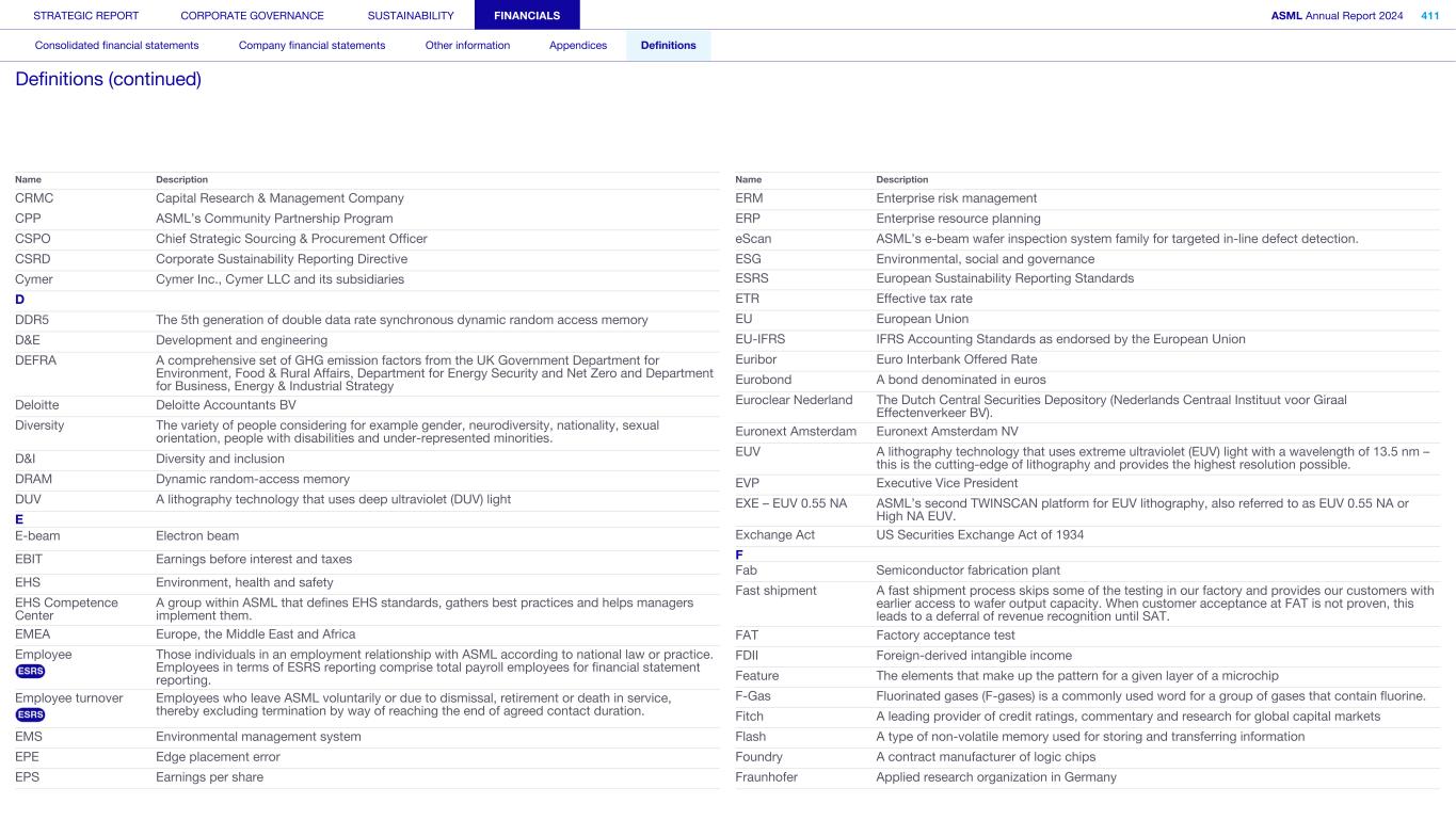CRMC Capital Research & Management Company CPP ASML’s Community Partnership Program CSPO Chief Strategic Sourcing & Procurement Officer CSRD Corporate Sustainability Reporting Directive Cymer Cymer Inc., Cymer LLC and its subsidiaries D DDR5 The 5th generation of double data rate synchronous dynamic random access memory D&E Development and engineering DEFRA A comprehensive set of GHG emission factors from the UK Government Department for Environment, Food & Rural Affairs, Department for Energy Security and Net Zero and Department for Business, Energy & Industrial Strategy Deloitte Deloitte Accountants BV Diversity The variety of people considering for example gender, neurodiversity, nationality, sexual orientation, people with disabilities and under-represented minorities. D&I Diversity and inclusion DRAM Dynamic random-access memory DUV A lithography technology that uses deep ultraviolet (DUV) light E E-beam Electron beam EBIT Earnings before interest and taxes EHS Environment, health and safety EHS Competence Center A group within ASML that defines EHS standards, gathers best practices and helps managers implement them. EMEA Europe, the Middle East and Africa Employee Those individuals in an employment relationship with ASML according to national law or practice. Employees in terms of ESRS reporting comprise total payroll employees for financial statement reporting. Employee turnover Employees who leave ASML voluntarily or due to dismissal, retirement or death in service, thereby excluding termination by way of reaching the end of agreed contact duration. EMS Environmental management system EPE Edge placement error EPS Earnings per share Name Description ERM Enterprise risk management ERP Enterprise resource planning eScan ASML’s e-beam wafer inspection system family for targeted in-line defect detection. ESG Environmental, social and governance ESRS European Sustainability Reporting Standards ETR Effective tax rate EU European Union EU-IFRS IFRS Accounting Standards as endorsed by the European Union Euribor Euro Interbank Offered Rate Eurobond A bond denominated in euros Euroclear Nederland The Dutch Central Securities Depository (Nederlands Centraal Instituut voor Giraal Effectenverkeer BV). Euronext Amsterdam Euronext Amsterdam NV EUV A lithography technology that uses extreme ultraviolet (EUV) light with a wavelength of 13.5 nm – this is the cutting-edge of lithography and provides the highest resolution possible. EVP Executive Vice President EXE – EUV 0.55 NA ASML’s second TWINSCAN platform for EUV lithography, also referred to as EUV 0.55 NA or High NA EUV. Exchange Act US Securities Exchange Act of 1934 F Fab Semiconductor fabrication plant Fast shipment A fast shipment process skips some of the testing in our factory and provides our customers with earlier access to wafer output capacity. When customer acceptance at FAT is not proven, this leads to a deferral of revenue recognition until SAT. FAT Factory acceptance test FDII Foreign-derived intangible income Feature The elements that make up the pattern for a given layer of a microchip F-Gas Fluorinated gases (F-gases) is a commonly used word for a group of gases that contain fluorine. Fitch A leading provider of credit ratings, commentary and research for global capital markets Flash A type of non-volatile memory used for storing and transferring information Foundry A contract manufacturer of logic chips Fraunhofer Applied research organization in Germany Name Description STRATEGIC REPORT CORPORATE GOVERNANCE SUSTAINABILITY FINANCIALS ASML Annual Report 2024 411 Consolidated financial statements Company financial statements Other information Appendices Definitions Definitions (continued)