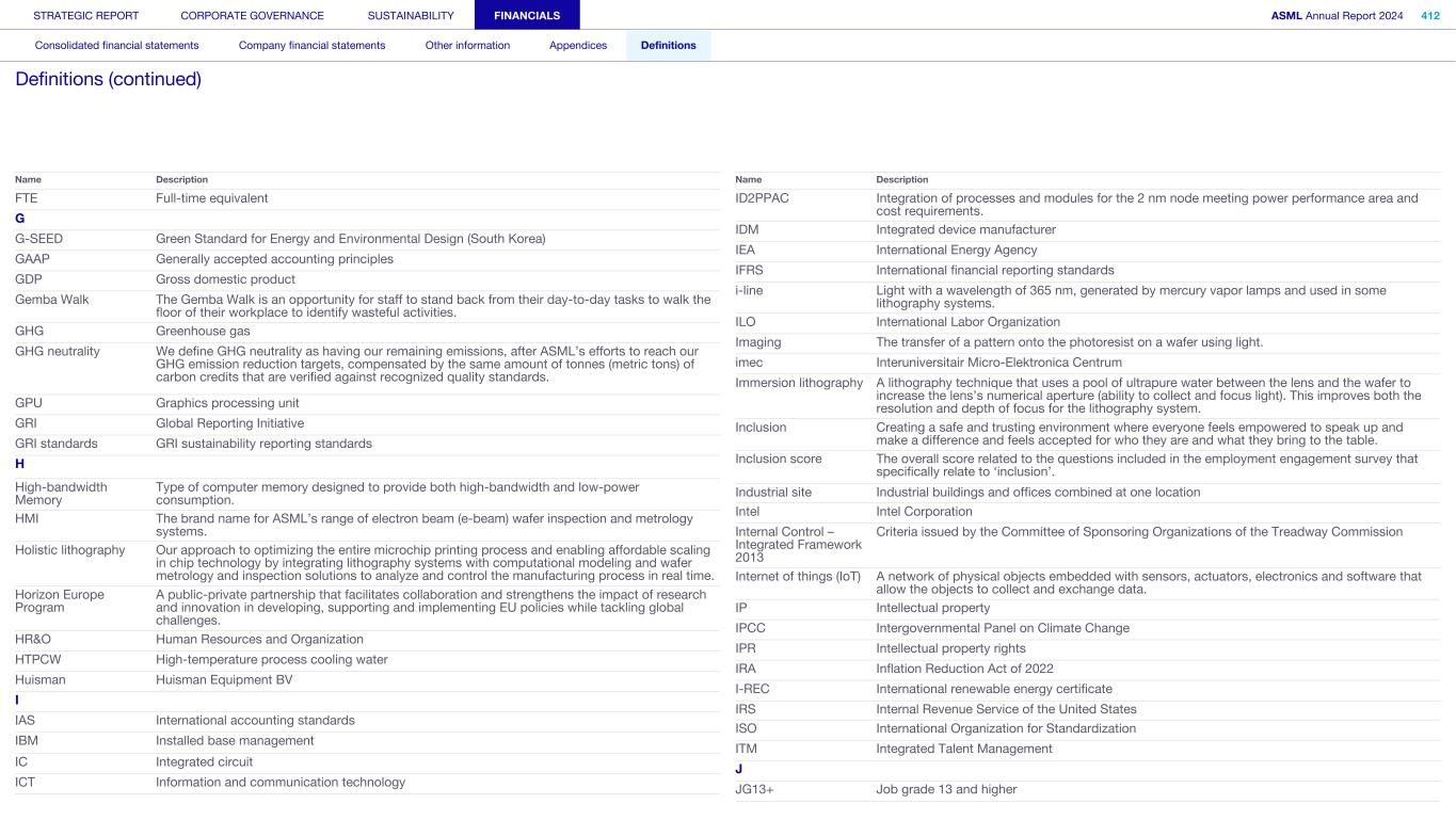 FTE Full-time equivalent G G-SEED Green Standard for Energy and Environmental Design (South Korea) GAAP Generally accepted accounting principles GDP Gross domestic product Gemba Walk The Gemba Walk is an opportunity for staff to stand back from their day-to-day tasks to walk the floor of their workplace to identify wasteful activities. GHG Greenhouse gas GHG neutrality We define GHG neutrality as having our remaining emissions, after ASML’s efforts to reach our GHG emission reduction targets, compensated by the same amount of tonnes (metric tons) of carbon credits that are verified against recognized quality standards. GPU Graphics processing unit GRI Global Reporting Initiative GRI standards GRI sustainability reporting standards H High-bandwidth Memory Type of computer memory designed to provide both high-bandwidth and low-power consumption. HMI The brand name for ASML’s range of electron beam (e-beam) wafer inspection and metrology systems. Holistic lithography Our approach to optimizing the entire microchip printing process and enabling affordable scaling in chip technology by integrating lithography systems with computational modeling and wafer metrology and inspection solutions to analyze and control the manufacturing process in real time. Horizon Europe Program A public-private partnership that facilitates collaboration and strengthens the impact of research and innovation in developing, supporting and implementing EU policies while tackling global challenges. HR&O Human Resources and Organization HTPCW High-temperature process cooling water Huisman Huisman Equipment BV I IAS International accounting standards IBM Installed base management IC Integrated circuit ICT Information and communication technology Name Description ID2PPAC Integration of processes and modules for the 2 nm node meeting power performance area and cost requirements. IDM Integrated device manufacturer IEA International Energy Agency IFRS International financial reporting standards i-line Light with a wavelength of 365 nm, generated by mercury vapor lamps and used in some lithography systems. ILO International Labor Organization Imaging The transfer of a pattern onto the photoresist on a wafer using light. imec Interuniversitair Micro-Elektronica Centrum Immersion lithography A lithography technique that uses a pool of ultrapure water between the lens and the wafer to increase the lens’s numerical aperture (ability to collect and focus light). This improves both the resolution and depth of focus for the lithography system. Inclusion Creating a safe and trusting environment where everyone feels empowered to speak up and make a difference and feels accepted for who they are and what they bring to the table. Inclusion score The overall score related to the questions included in the employment engagement survey that specifically relate to ‘inclusion’. Industrial site Industrial buildings and offices combined at one location Intel Intel Corporation Internal Control – Integrated Framework 2013 Criteria issued by the Committee of Sponsoring Organizations of the Treadway Commission Internet of things (IoT) A network of physical objects embedded with sensors, actuators, electronics and software that allow the objects to collect and exchange data. IP Intellectual property IPCC Intergovernmental Panel on Climate Change IPR Intellectual property rights IRA Inflation Reduction Act of 2022 I-REC International renewable energy certificate IRS Internal Revenue Service of the United States ISO International Organization for Standardization ITM Integrated Talent Management J JG13+ Job grade 13 and higher Name Description STRATEGIC REPORT CORPORATE GOVERNANCE SUSTAINABILITY FINANCIALS ASML Annual Report 2024 412 Consolidated financial statements Company financial statements Other information Appendices Definitions Definitions (continued)