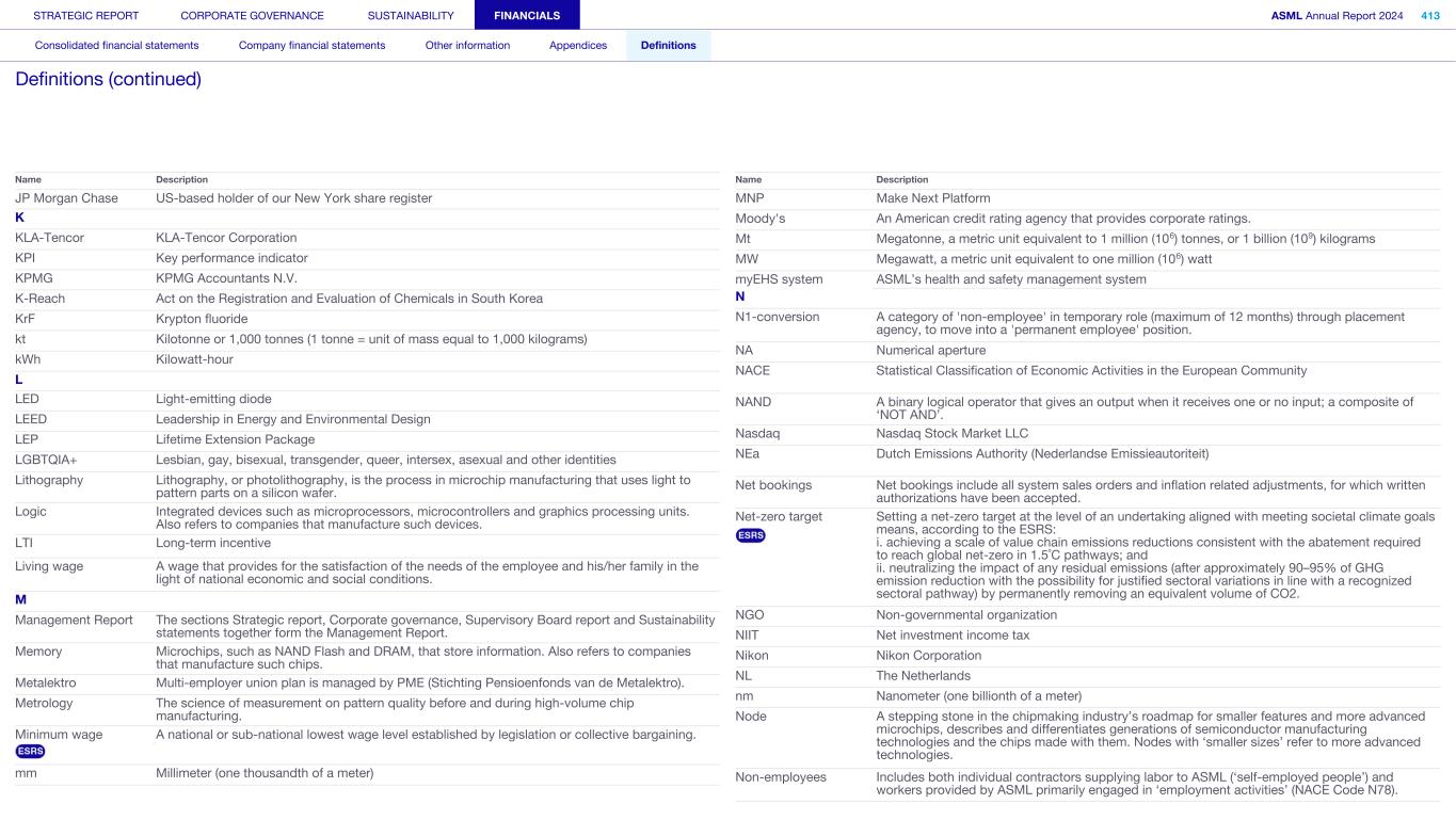 JP Morgan Chase US-based holder of our New York share register K KLA-Tencor KLA-Tencor Corporation KPI Key performance indicator KPMG KPMG Accountants N.V. K-Reach Act on the Registration and Evaluation of Chemicals in South Korea KrF Krypton fluoride kt Kilotonne or 1,000 tonnes (1 tonne = unit of mass equal to 1,000 kilograms) kWh Kilowatt-hour L LED Light-emitting diode LEED Leadership in Energy and Environmental Design LEP Lifetime Extension Package LGBTQIA+ Lesbian, gay, bisexual, transgender, queer, intersex, asexual and other identities Lithography Lithography, or photolithography, is the process in microchip manufacturing that uses light to pattern parts on a silicon wafer. Logic Integrated devices such as microprocessors, microcontrollers and graphics processing units. Also refers to companies that manufacture such devices. LTI Long-term incentive Living wage A wage that provides for the satisfaction of the needs of the employee and his/her family in the light of national economic and social conditions. M Management Report The sections Strategic report, Corporate governance, Supervisory Board report and Sustainability statements together form the Management Report. Memory Microchips, such as NAND Flash and DRAM, that store information. Also refers to companies that manufacture such chips. Metalektro Multi-employer union plan is managed by PME (Stichting Pensioenfonds van de Metalektro). Metrology The science of measurement on pattern quality before and during high-volume chip manufacturing. Minimum wage A national or sub-national lowest wage level established by legislation or collective bargaining. mm Millimeter (one thousandth of a meter) Name Description MNP Make Next Platform Moody's An American credit rating agency that provides corporate ratings. Mt Megatonne, a metric unit equivalent to 1 million (106) tonnes, or 1 billion (109) kilograms MW Megawatt, a metric unit equivalent to one million (106) watt myEHS system ASML’s health and safety management system N N1-conversion A category of 'non-employee' in temporary role (maximum of 12 months) through placement agency, to move into a 'permanent employee' position. NA Numerical aperture NACE Statistical Classification of Economic Activities in the European Community NAND A binary logical operator that gives an output when it receives one or no input; a composite of ‘NOT AND’. Nasdaq Nasdaq Stock Market LLC NEa Dutch Emissions Authority (Nederlandse Emissieautoriteit) Net bookings Net bookings include all system sales orders and inflation related adjustments, for which written authorizations have been accepted. Net-zero target Setting a net-zero target at the level of an undertaking aligned with meeting societal climate goals means, according to the ESRS: i. achieving a scale of value chain emissions reductions consistent with the abatement required to reach global net-zero in 1.5˚C pathways; and ii. neutralizing the impact of any residual emissions (after approximately 90–95% of GHG emission reduction with the possibility for justified sectoral variations in line with a recognized sectoral pathway) by permanently removing an equivalent volume of CO2. NGO Non-governmental organization NIIT Net investment income tax Nikon Nikon Corporation NL The Netherlands nm Nanometer (one billionth of a meter) Node A stepping stone in the chipmaking industry’s roadmap for smaller features and more advanced microchips, describes and differentiates generations of semiconductor manufacturing technologies and the chips made with them. Nodes with ‘smaller sizes’ refer to more advanced technologies. Non-employees Includes both individual contractors supplying labor to ASML (‘self-employed people’) and workers provided by ASML primarily engaged in ‘employment activities’ (NACE Code N78). Name Description STRATEGIC REPORT CORPORATE GOVERNANCE SUSTAINABILITY FINANCIALS ASML Annual Report 2024 413 Consolidated financial statements Company financial statements Other information Appendices Definitions Definitions (continued)