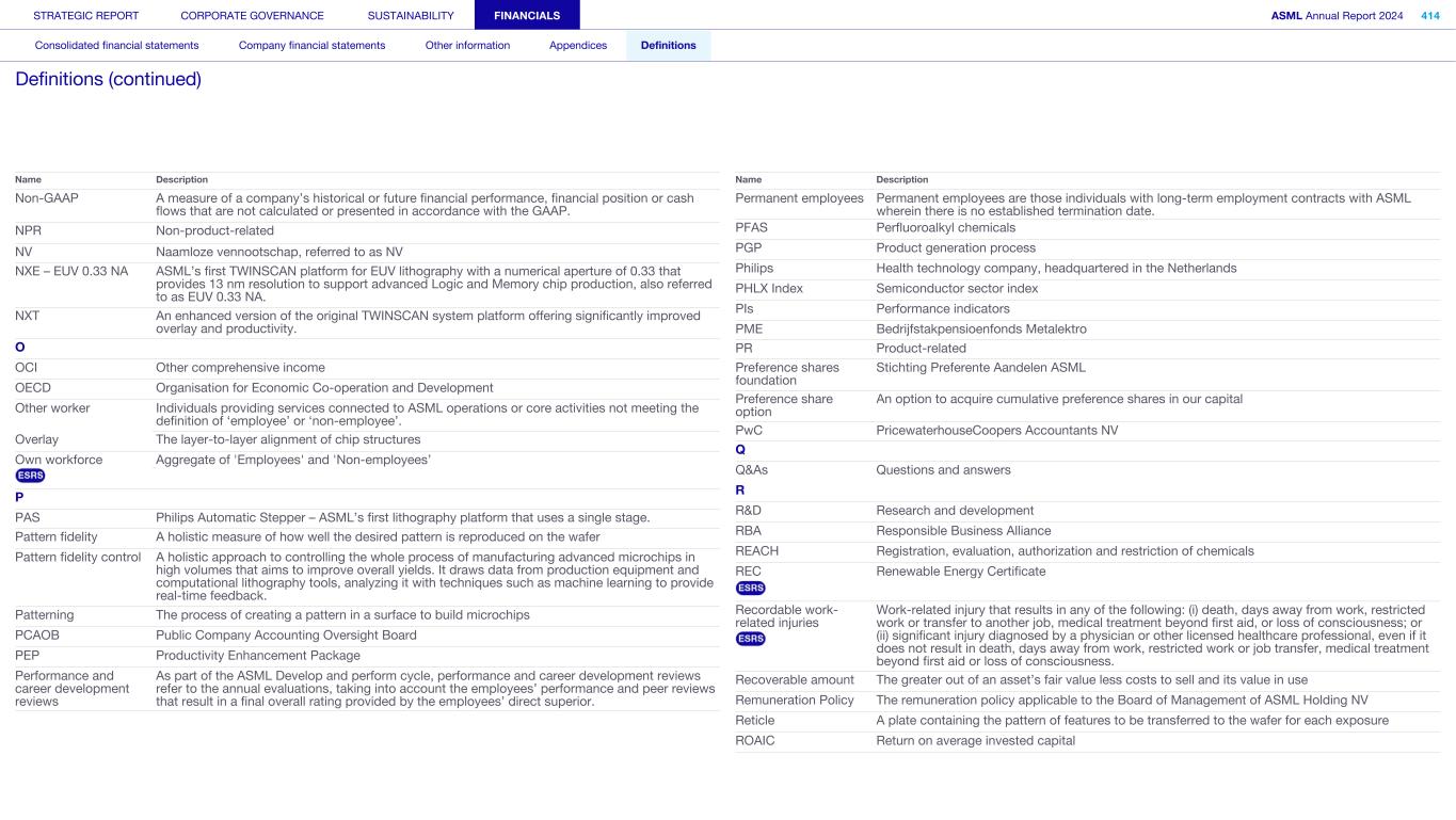 Non-GAAP A measure of a company’s historical or future financial performance, financial position or cash flows that are not calculated or presented in accordance with the GAAP. NPR Non-product-related NV Naamloze vennootschap, referred to as NV NXE – EUV 0.33 NA ASML’s first TWINSCAN platform for EUV lithography with a numerical aperture of 0.33 that provides 13 nm resolution to support advanced Logic and Memory chip production, also referred to as EUV 0.33 NA. NXT An enhanced version of the original TWINSCAN system platform offering significantly improved overlay and productivity. O OCI Other comprehensive income OECD Organisation for Economic Co-operation and Development Other worker Individuals providing services connected to ASML operations or core activities not meeting the definition of ‘employee’ or ‘non-employee’. Overlay The layer-to-layer alignment of chip structures Own workforce Aggregate of 'Employees' and 'Non-employees’ P PAS Philips Automatic Stepper – ASML’s first lithography platform that uses a single stage. Pattern fidelity A holistic measure of how well the desired pattern is reproduced on the wafer Pattern fidelity control A holistic approach to controlling the whole process of manufacturing advanced microchips in high volumes that aims to improve overall yields. It draws data from production equipment and computational lithography tools, analyzing it with techniques such as machine learning to provide real-time feedback. Patterning The process of creating a pattern in a surface to build microchips PCAOB Public Company Accounting Oversight Board PEP Productivity Enhancement Package Performance and career development reviews As part of the ASML Develop and perform cycle, performance and career development reviews refer to the annual evaluations, taking into account the employees’ performance and peer reviews that result in a final overall rating provided by the employees’ direct superior. Name Description Permanent employees Permanent employees are those individuals with long-term employment contracts with ASML wherein there is no established termination date. PFAS Perfluoroalkyl chemicals PGP Product generation process Philips Health technology company, headquartered in the Netherlands PHLX Index Semiconductor sector index PIs Performance indicators PME Bedrijfstakpensioenfonds Metalektro PR Product-related Preference shares foundation Stichting Preferente Aandelen ASML Preference share option An option to acquire cumulative preference shares in our capital PwC PricewaterhouseCoopers Accountants NV Q Q&As Questions and answers R R&D Research and development RBA Responsible Business Alliance REACH Registration, evaluation, authorization and restriction of chemicals REC Renewable Energy Certificate Recordable work- related injuries Work-related injury that results in any of the following: (i) death, days away from work, restricted work or transfer to another job, medical treatment beyond first aid, or loss of consciousness; or (ii) significant injury diagnosed by a physician or other licensed healthcare professional, even if it does not result in death, days away from work, restricted work or job transfer, medical treatment beyond first aid or loss of consciousness. Recoverable amount The greater out of an asset’s fair value less costs to sell and its value in use Remuneration Policy The remuneration policy applicable to the Board of Management of ASML Holding NV Reticle A plate containing the pattern of features to be transferred to the wafer for each exposure ROAIC Return on average invested capital Name Description STRATEGIC REPORT CORPORATE GOVERNANCE SUSTAINABILITY FINANCIALS ASML Annual Report 2024 414 Consolidated financial statements Company financial statements Other information Appendices Definitions Definitions (continued)