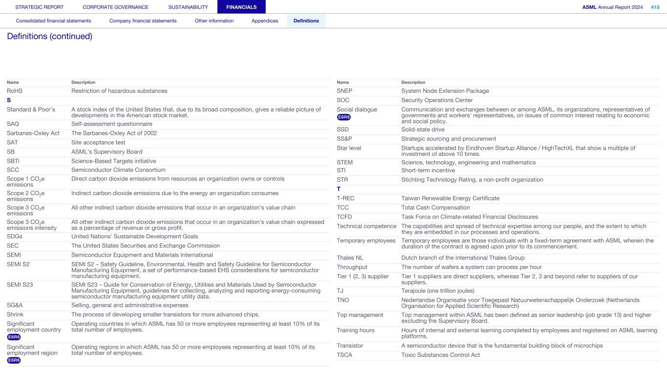 RoHS Restriction of hazardous substances S Standard & Poor's A stock index of the United States that, due to its broad composition, gives a reliable picture of developments in the American stock market. SAQ Self-assessment questionnaire Sarbanes-Oxley Act The Sarbanes-Oxley Act of 2002 SAT Site acceptance test SB ASML’s Supervisory Board SBTi Science-Based Targets initiative SCC Semiconductor Climate Consortium Scope 1 CO2e emissions Direct carbon dioxide emissions from resources an organization owns or controls Scope 2 CO2e emissions Indirect carbon dioxide emissions due to the energy an organization consumes Scope 3 CO2e emissions All other indirect carbon dioxide emissions that occur in an organization’s value chain Scope 3 CO2e emissions intensity All other indirect carbon dioxide emissions that occur in an organization’s value chain expressed as a percentage of revenue or gross profit. SDGs United Nations' Sustainable Development Goals SEC The United States Securities and Exchange Commission SEMI Semiconductor Equipment and Materials International SEMI S2 SEMI S2 – Safety Guideline, Environmental, Health and Safety Guideline for Semiconductor Manufacturing Equipment, a set of performance-based EHS considerations for semiconductor manufacturing equipment. SEMI S23 SEMI S23 – Guide for Conservation of Energy, Utilities and Materials Used by Semiconductor Manufacturing Equipment, guidelines for collecting, analyzing and reporting energy-consuming semiconductor manufacturing equipment utility data. SG&A Selling, general and administrative expenses Shrink The process of developing smaller transistors for more advanced chips. Significant employment country Operating countries in which ASML has 50 or more employees representing at least 10% of its total number of employees. Significant employment region Operating regions in which ASML has 50 or more employees representing at least 10% of its total number of employees. Name Description SNEP System Node Extension Package SOC Security Operations Center Social dialogue Communication and exchanges between or among ASML, its organizations, representatives of governments and workers’ representatives, on issues of common interest relating to economic and social policy. SSD Solid-state drive SS&P Strategic sourcing and procurement Star level Startups accelerated by Eindhoven Startup Alliance / HighTechXL that show a multiple of investment of above 10 times. STEM Science, technology, engineering and mathematics STI Short-term incentive STR Stichting Technology Rating, a non-profit organization T T-REC Taiwan Renewable Energy Certificate TCC Total Cash Compensation TCFD Task Force on Climate-related Financial Disclosures Technical competence The capabilities and spread of technical expertise among our people, and the extent to which they are embedded in our processes and operations. Temporary employees Temporary employees are those individuals with a fixed-term agreement with ASML wherein the duration of the contract is agreed upon prior to its commencement. Thales NL Dutch branch of the international Thales Group Throughput The number of wafers a system can process per hour Tier 1 (2, 3) supplier Tier 1 suppliers are direct suppliers, whereas Tier 2, 3 and beyond refer to suppliers of our suppliers. TJ Terajoule (one trillion joules) TNO Nederlandse Organisatie voor Toegepast Natuurwetenschappelijk Onderzoek (Netherlands Organisation for Applied Scientific Research) Top management Top management within ASML has been defined as senior leadership (job grade 13) and higher excluding the Supervisory Board. Training hours Hours of internal and external learning completed by employees and registered on ASML learning platforms. Transistor A semiconductor device that is the fundamental building block of microchips TSCA Toxic Substances Control Act Name Description STRATEGIC REPORT CORPORATE GOVERNANCE SUSTAINABILITY FINANCIALS ASML Annual Report 2024 415 Consolidated financial statements Company financial statements Other information Appendices Definitions Definitions (continued)
