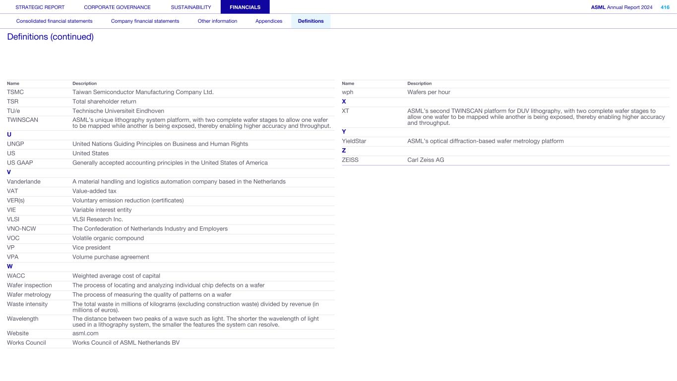 TSMC Taiwan Semiconductor Manufacturing Company Ltd. TSR Total shareholder return TU/e Technische Universiteit Eindhoven TWINSCAN ASML’s unique lithography system platform, with two complete wafer stages to allow one wafer to be mapped while another is being exposed, thereby enabling higher accuracy and throughput. U UNGP United Nations Guiding Principles on Business and Human Rights US United States US GAAP Generally accepted accounting principles in the United States of America V Vanderlande A material handling and logistics automation company based in the Netherlands VAT Value-added tax VER(s) Voluntary emission reduction (certificates) VIE Variable interest entity VLSI VLSI Research Inc. VNO-NCW The Confederation of Netherlands Industry and Employers VOC Volatile organic compound VP Vice president VPA Volume purchase agreement W WACC Weighted average cost of capital Wafer inspection The process of locating and analyzing individual chip defects on a wafer Wafer metrology The process of measuring the quality of patterns on a wafer Waste intensity The total waste in millions of kilograms (excluding construction waste) divided by revenue (in millions of euros). Wavelength The distance between two peaks of a wave such as light. The shorter the wavelength of light used in a lithography system, the smaller the features the system can resolve. Website asml.com Works Council Works Council of ASML Netherlands BV Name Description wph Wafers per hour X XT ASML’s second TWINSCAN platform for DUV lithography, with two complete wafer stages to allow one wafer to be mapped while another is being exposed, thereby enabling higher accuracy and throughput. Y YieldStar ASML’s optical diffraction-based wafer metrology platform Z ZEISS Carl Zeiss AG Name Description STRATEGIC REPORT CORPORATE GOVERNANCE SUSTAINABILITY FINANCIALS ASML Annual Report 2024 416 Consolidated financial statements Company financial statements Other information Appendices Definitions Definitions (continued)