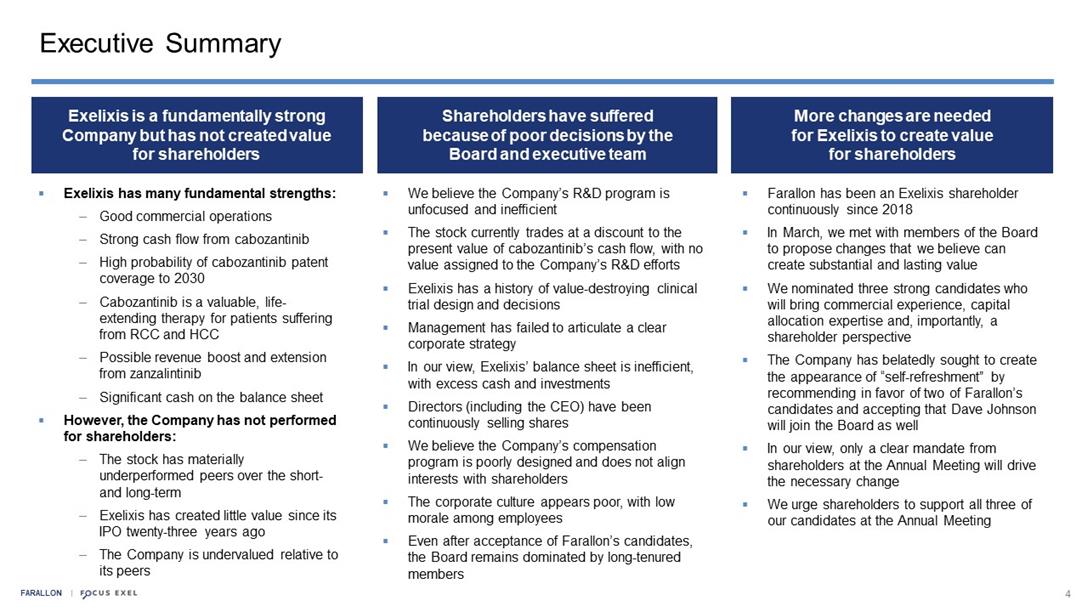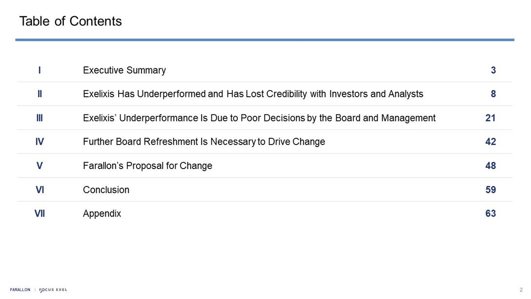 FARALLON | Table of Contents I Executive Summary 3 II Exelixis Has Underperformed and Has Lost Credibility with Investors and Analysts 8 III Exelixis ’ Underperformance Is Due to Poor Decisions by the Board and Management 21 IV Further Board Refreshment Is Necessary to Drive Change 42 V Farallon’s Proposal for Change 48 VI Conclusion 59 VII Appendix 63 2