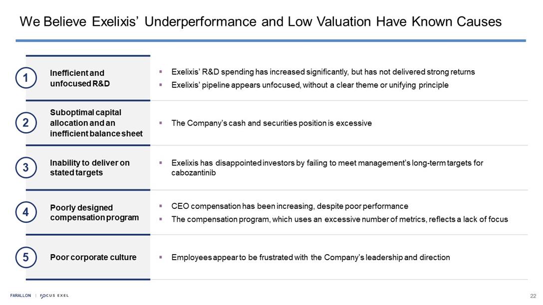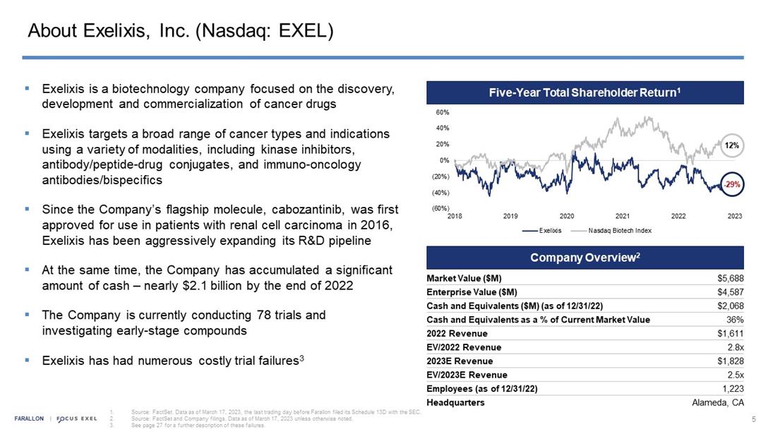 FARALLON | Executive Summary 4 ▪ Exelixis has many fundamental strengths: – Good commercial operations – Strong cash flow from cabozantinib – High probability of cabozantinib patent coverage to 2030 – Cabozantinib is a valuable, life - extending therapy for patients suffering from RCC and HCC – Possible revenue boost and extension from zanzalintinib – Significant cash on the balance sheet ▪ However, the Company has not performed for shareholders: – The stock has materially underperformed peers over the short - and long - term – Exelixis has created little value since its IPO twenty - three years ago – The Company is undervalued relative to its peers ▪ We believe the Company’s R&D program is unfocused and inefficient ▪ The stock currently trades at a discount to the present value of cabozantinib’s cash flow, with no value assigned to the Company’s R&D efforts ▪ Exelixis has a history of value - destroying clinical trial design and decisions ▪ Management has failed to articulate a clear corporate strategy ▪ In our view, Exelixis ’ balance sheet is inefficient, with excess cash and investments ▪ Directors (including the CEO) have been continuously selling shares ▪ We believe the Company’s compensation program is poorly designed and does not align interests with shareholders ▪ The corporate culture appears poor, with low morale among employees ▪ Even after acceptance of Farallon’s candidates, the Board remains dominated by long - tenured members ▪ Farallon has been an Exelixis shareholder continuously since 2018 ▪ In March, we met with members of the Board to propose changes that we believe can create substantial and lasting value ▪ We nominated three strong candidates who will bring commercial experience, capital allocation expertise and, importantly, a shareholder perspective ▪ The Company has belatedly sought to create the appearance of “self - refreshment” by recommending in favor of two of Farallon’s candidates and accepting that Dave Johnson will join the Board as well ▪ In our view, only a clear mandate from shareholders at the Annual Meeting will drive the necessary change ▪ We urge shareholders to support all three of our candidates at the Annual Meeting Exelixis is a fundamentally strong Company but has not created value for shareholders Shareholders have suffered because of poor decisions by the Board and executive team More changes are needed for Exelixis to create value for shareholders