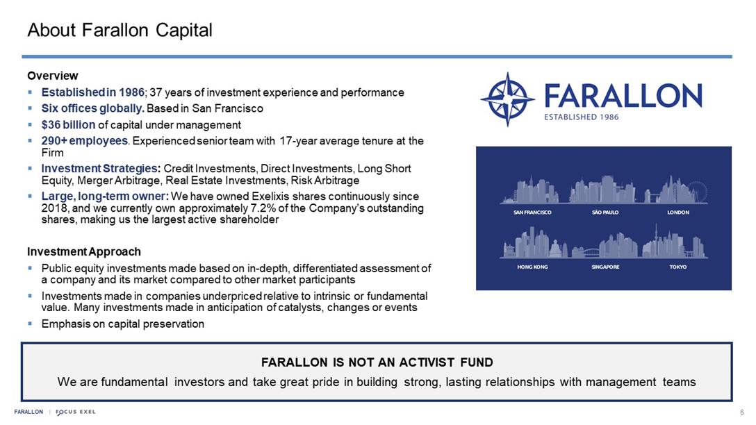 FARALLON | About Exelixis , Inc. (Nasdaq: EXEL) 5 Five - Year Total Shareholder Return 1 Company Overview 2 ▪ Exelixis is a biotechnology company focused on the discovery, development and commercialization of cancer drugs ▪ Exelixis targets a broad range of cancer types and indications using a variety of modalities, including kinase inhibitors, antibody/peptide - drug conjugates, and immuno - oncology antibodies/ bispecifics ▪ Since the Company’s flagship molecule, cabozantinib , was first approved for use in patients with renal cell carcinoma in 2016, Exelixis has been aggressively expanding its R&D pipeline ▪ At the same time, the Company has accumulated a significant amount of cash – nearly $2.1 billion by the end of 2022 ▪ The Company is currently conducting 78 trials and investigating early - stage compounds ▪ Exelixis has had numerous costly trial failures 3 (60%) (40%) (20%) 0% 20% 40% 60% 2018 2019 2020 2021 2022 2023 Exelixis Nasdaq Biotech Index Market Value ($M) $5,688 Enterprise Value ($M) $4,587 Cash and Equivalents ($M) (as of 12/31/22) $2,068 Cash and Equivalents as a % of Current Market Value 36% 2022 Revenue $1,611 EV/2022 Revenue 2.8x 2023E Revenue $1,828 EV/2023E Revenue 2.5x Employees (as of 12/31/22) 1,223 Headquarters Alameda, CA 1. Source: FactSet. Data as of March 17, 2023, the last trading day before Farallon filed its Schedule 13D with the SEC. 2. Source: FactSet and Company filings. Data as of March 17, 2023 unless otherwise noted. 3. See page 27 for a further description of these failures. - 29% 12%