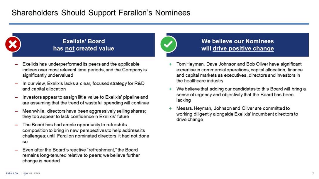 FARALLON | About Farallon Capital 6 Overview ▪ Established in 1986 ; 37 years of investment experience and performance ▪ Six offices globally. Based in San Francisco ▪ $36 billion of capital under management ▪ 2 90+ employees . Experienced senior team with 17 - year average tenure at the Firm ▪ Investment Strategies : Credit Investments, Direct Investments, Long Short Equity, Merger Arbitrage, Real Estate Investments, Risk Arbitrage ▪ Large, long - term owner: We have owned Exelixis shares continuously since 2018, and we currently own approximately 7.2% of the Company’s outstanding shares, making us the largest active shareholder Investment Approach ▪ Public equity investments made based on in - depth, differentiated assessment of a company and its market compared to other market participants ▪ Investments made in companies underpriced relative to intrinsic or fundamental value. Many investments made in anticipation of catalysts, changes or events ▪ Emphasis on capital preservation FARALLON IS NOT AN ACTIVIST FUND We are fundamental investors and take great pride in building strong, lasting relationships with management teams