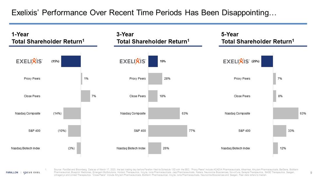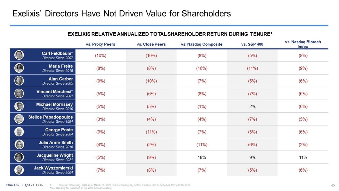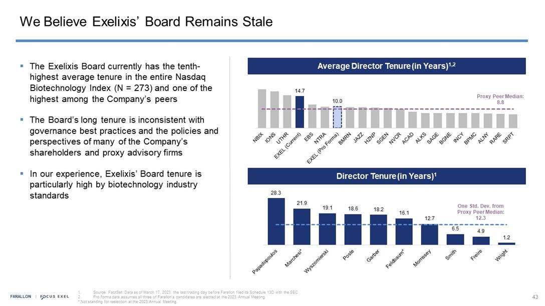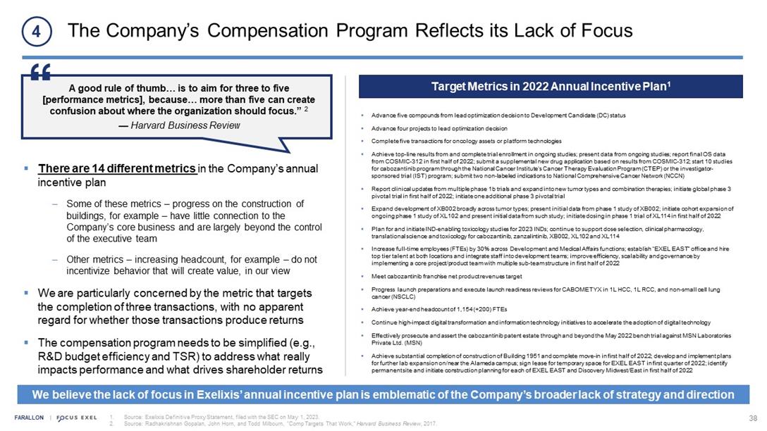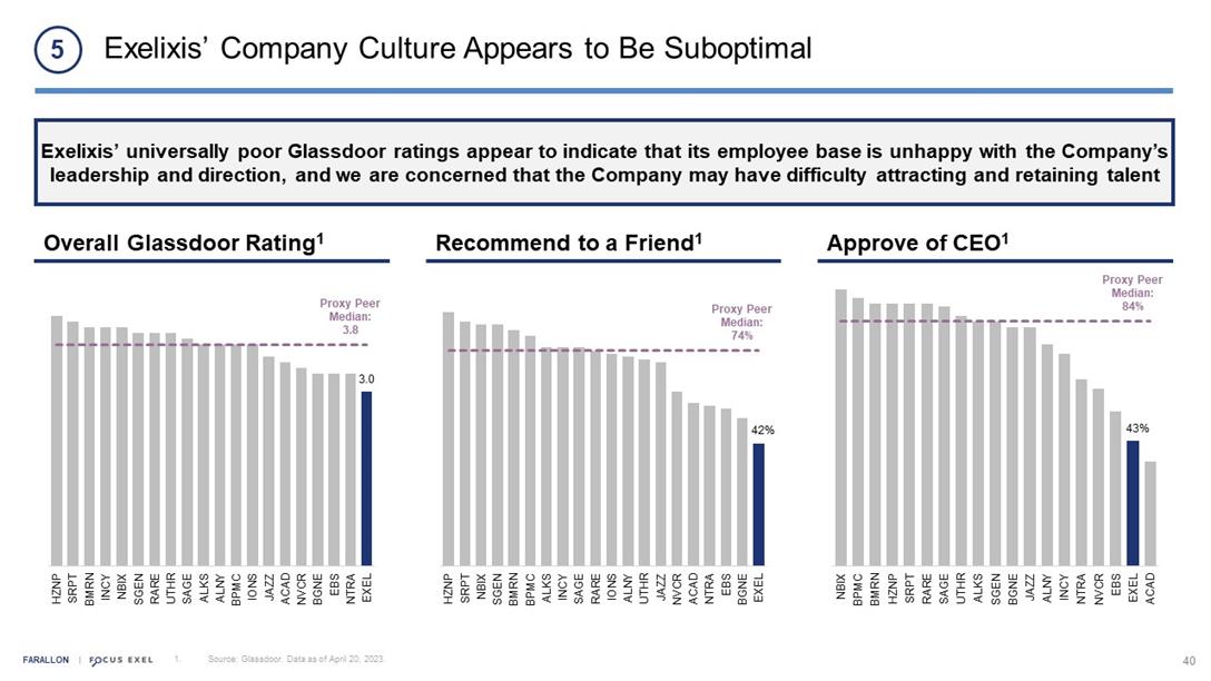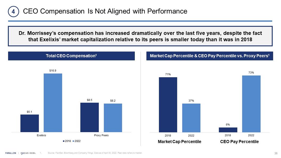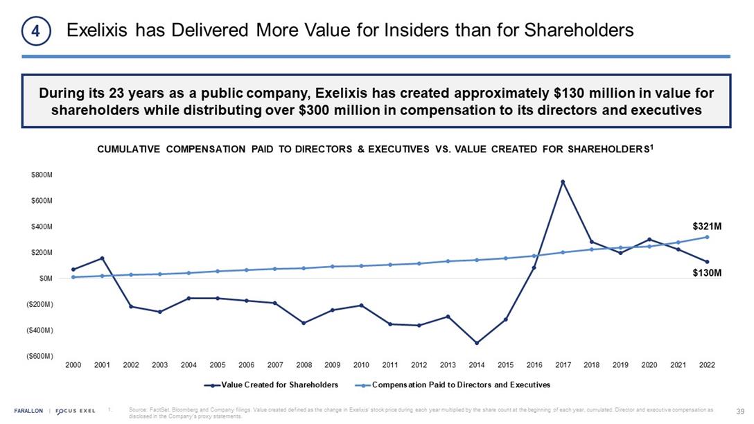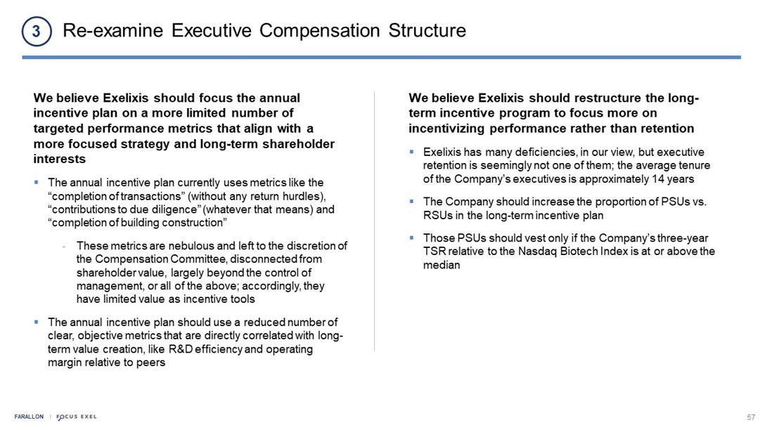 FARALLON | The Company’s Compensation Program Reflects its Lack of Focus 38 ▪ There are 14 different metrics in the Company’s annual incentive plan – Some of these metrics – progress on the construction of buildings, for example – have little connection to the Company’s core business and are largely beyond the control of the executive team – Other metrics – increasing headcount, for example – do not incentivize behavior that will create value, in our view ▪ We are particularly concerned by the metric that targets the completion of three transactions, with no apparent regard for whether those transactions produce returns ▪ The compensation program needs to be simplified (e.g., R&D budget efficiency and TSR) to address what really impacts performance and what drives shareholder returns Target Metrics in 2022 Annual Incentive Plan 1 1. Source: Exelixis Definitive Proxy Statement, filed with the SEC on May 1, 2023. 2. Source: Radhakrishnan Gopalan, John Horn, and Todd Milbourn, “Comp Targets That Work,” Harvard Business Review , 2017. 4 ▪ Advance five compounds from lead optimization decision to Development Candidate (DC) status ▪ Advance four projects to lead optimization decision ▪ Complete five transactions for oncology assets or platform technologies ▪ Achieve top - line results from and complete trial enrollment in ongoing studies; present data from ongoing studies; report final OS data from COSMIC - 312 in first half of 2022; submit a supplemental new drug application based on results from COSMIC - 312; start 10 stu dies for cabozantinib program through the National Cancer Institute’s Cancer Therapy Evaluation Program (CTEP) or the investigator - sponsored trial (IST) program; submit two non - labeled indications to National Comprehensive Cancer Network (NCCN) ▪ Report clinical updates from multiple phase 1b trials and expand into new tumor types and combination therapies; initiate glo bal phase 3 pivotal trial in first half of 2022; initiate one additional phase 3 pivotal trial ▪ Expand development of XB002 broadly across tumor types; present initial data from phase 1 study of XB002; initiate cohort exp ans ion of ongoing phase 1 study of XL102 and present initial data from such study; initiate dosing in phase 1 trial of XL114 in first h alf of 2022 ▪ Plan for and initiate IND - enabling toxicology studies for 2023 INDs; continue to support dose selection, clinical pharmacology, translational science and toxicology for cabozantinib , zanzalintinib , XB002, XL102 and XL114 ▪ Increase full - time employees (FTEs) by 30% across Development and Medical Affairs functions; establish “EXEL EAST” office and hi re top tier talent at both locations and integrate staff into development teams; improve efficiency, scalability and governance by implementing a core project/product team with multiple sub - team structure in first half of 2022 ▪ Meet cabozantinib franchise net product revenues target ▪ Progress launch preparations and execute launch readiness reviews for CABOMETYX in 1L HCC, 1L RCC, and non - small cell lung cancer (NSCLC) ▪ Achieve year - end headcount of 1,154 (+200) FTEs ▪ Continue high - impact digital transformation and information technology initiatives to accelerate the adoption of digital technol ogy ▪ Effectively prosecute and assert the cabozantinib patent estate through and beyond the May 2022 bench trial against MSN Laboratories Private Ltd. (MSN) ▪ Achieve substantial completion of construction of Building 1951 and complete move - in in first half of 2022; develop and implemen t plans for further lab expansion on/near the Alameda campus; sign lease for temporary space for EXEL EAST in first quarter of 2022; ide ntify permanent site and initiate construction planning for each of EXEL EAST and Discovery Midwest/East in first half of 2022 A good rule of thumb… is to aim for three to five [performance metrics], because… more than five can create confusion about where the organization should focus.” 2 — Harvard Business Review We believe the lack of focus in Exelixis ’ annual incentive plan is emblematic of the Company’s broader lack of strategy and direction