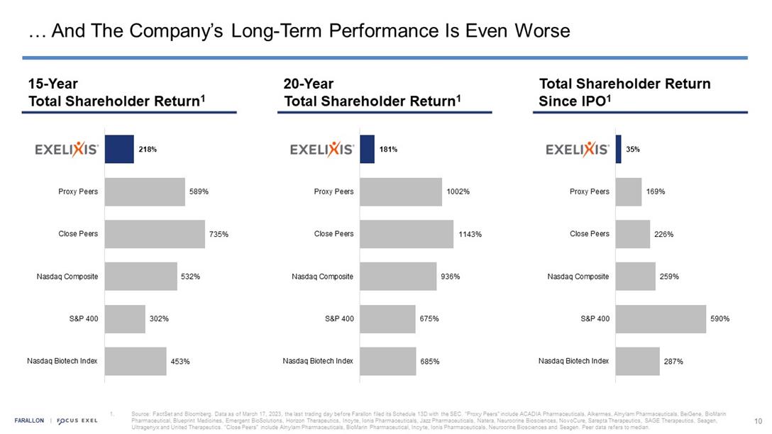 FARALLON | Exelixis’ Performance Over Recent Time Periods Has Been Disappointing… 9 1 - Year Total Shareholder Return 1 3 - Year Total Shareholder Return 1 5 - Year Total Shareholder Return 1 1. Source: FactSet and Bloomberg. Data as of March 17, 2023, the last trading day before Farallon filed its Schedule 13D with th e S EC. “Proxy Peers” include ACADIA Pharmaceuticals, Alkermes, Alnylam Pharmaceuticals, BeiGene , BioMarin Pharmaceutical, Blueprint Medicines, Emergent BioSolutions, Horizon Therapeutics, Incyte, Ionis Pharmaceuticals, Jazz Pharmac eut icals, Natera , Neurocrine Biosciences, NovoCure , Sarepta Therapeutics, SAGE Therapeutics, Seagen , Ultragenyx and United Therapeutics. “Close Peers” include Alnylam Pharmaceuticals, BioMarin Pharmaceutical, Incyte, Ionis Pha rma ceuticals, Neurocrine Biosciences and Seagen. Peer data refers to median. (15%) 1% 7% (14%) (10%) (3%) Proxy Peers Close Peers Nasdaq Composite S&P 400 Nasdaq Biotech Index 19% 28% 18% 63% 77% 26% Proxy Peers Close Peers Nasdaq Composite S&P 400 Nasdaq Biotech Index (29%) 7% 8% 63% 33% 12% Proxy Peers Close Peers Nasdaq Composite S&P 400 Nasdaq Biotech Index