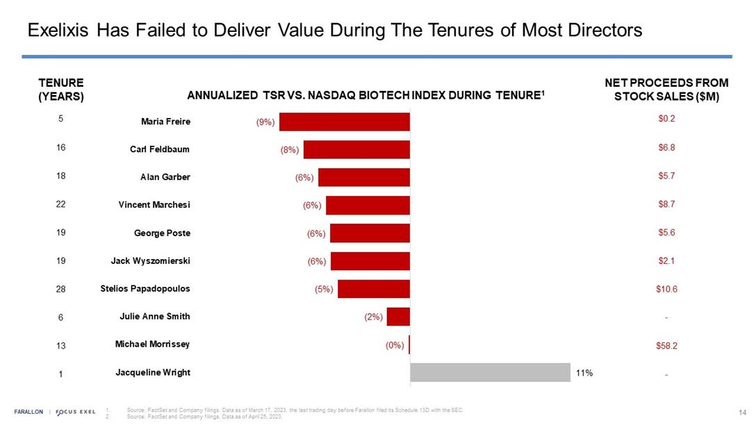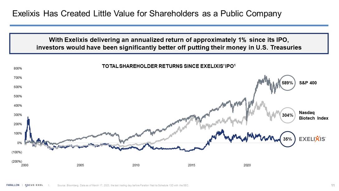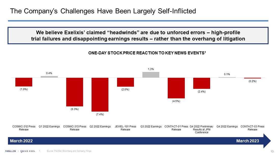 FARALLON | We Believe Exelixis ’ Claim that its TSR Has Been Impacted By “Headwinds” Is Disingenuous 12 1. Source: Exelixis Letter to Shareholders, filed with the SEC on May 1, 2023. 2. Source: Bloomberg. Data as of March 17, 2023, the last trading day before Farallon filed its Schedule 13D with the SEC. Data run s until September 25, 2019, the last day before Exelixis ’ first public disclosure that an Abbreviated New Drug Application was submitted to the FDA for a generic version of CABOMETYX. (200%) (100%) 0% 100% 200% 300% 400% 500% 2000 2001 2002 2003 2004 2005 2006 2007 2008 2009 2010 2011 2012 2013 2014 2015 2016 2017 2018 2019 TOTAL SHAREHOLDER RETURNS FROM EXELIXIS’ IPO TO SEPTEMBER 2019 2 218% 46% 436% Exelixis has attempted to justify its long - term underperformance by claiming that it has “experienced headwinds due to ongoing… legal proceedings,” 1 but the Company had been a long - term underperformer even before these proceedings began Nasdaq Biotech Index S&P 400