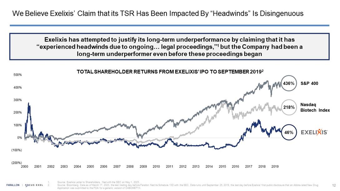 FARALLON | Exelixis Has Created Little Value for Shareholders as a Public Company 11 1. Source: Bloomberg. Data as of March 17, 2023, the last trading day before Farallon filed its Schedule 13D with the SEC. (200%) (100%) 0% 100% 200% 300% 400% 500% 600% 700% 800% 2000 2005 2010 2015 2020 TOTAL SHAREHOLDER RETURNS SINCE EXELIXIS’ IPO 1 304% 35% 589% With Exelixis delivering an annualized return of approximately 1% since its IPO, investors would have been significantly better off putting their money in U.S. Treasuries Nasdaq Biotech Index S&P 400