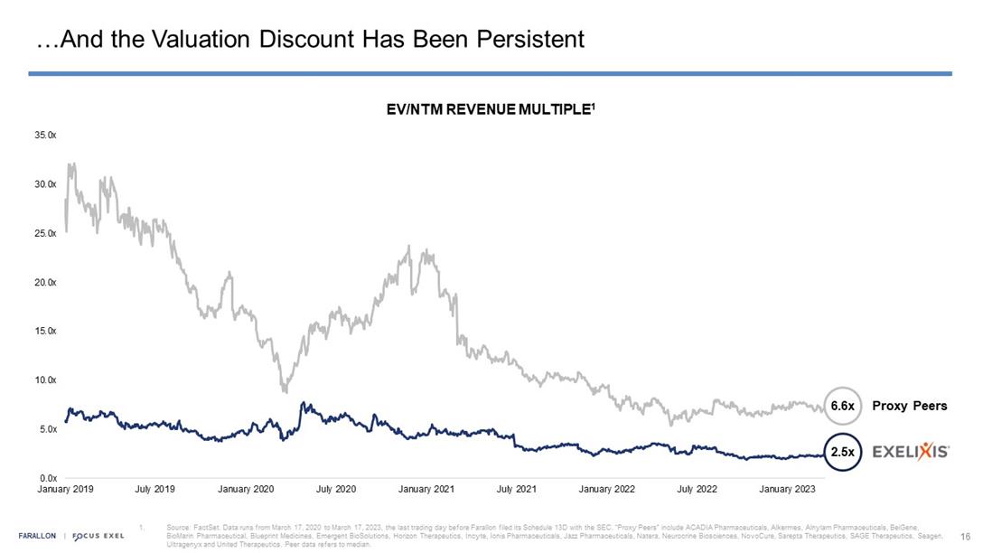 FARALLON | Exelixis Is Significantly Undervalued Relative to Peers… 15 EV/REVENUE MULTIPLES 1 1. Source: FactSet. Data as of March 17, 2023, the last trading day before Farallon filed its Schedule 13D with the SEC. “Proxy Pee rs” include ACADIA Pharmaceuticals, Alkermes, Alnylam Pharmaceuticals, BeiGene , BioMarin Pharmaceutical, Blueprint Medicines, Emergent BioSolutions, Horizon Therapeutics, Incyte, Ionis Pharmaceuticals, Jazz Pharmaceuticals, Natera , Neurocrine Biosciences, NovoCure , Sarepta Therapeutics, SAGE Therapeutics, Seagen , Ultragenyx and United Therapeutics. “Close Peers” include Alnylam Pharmaceuticals, BioMarin Pharmaceutical, Incyte, Ionis Pharmaceuticals, Neurocri ne Biosciences and Seagen. Peer data refers to median. 2.5x 2.2x 2.0x 6.6x 5.3x 3.8x 7.1x 6.0x 4.8x 2023E 2024E 2025E Exelixis Proxy Peers Close Peers On a pure valuation basis, EXEL shares are inexpensive by every valuation metric we use… One would think that given EXEL’s stock price performance, its business is in jeopardy…” — EF Hutton Research Report, October 31, 2022