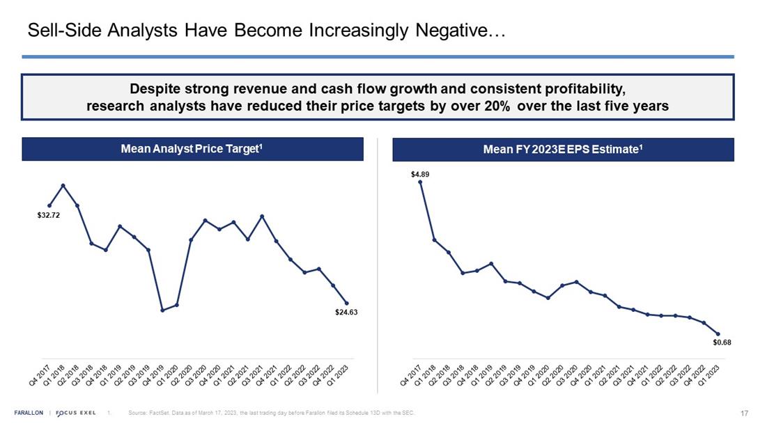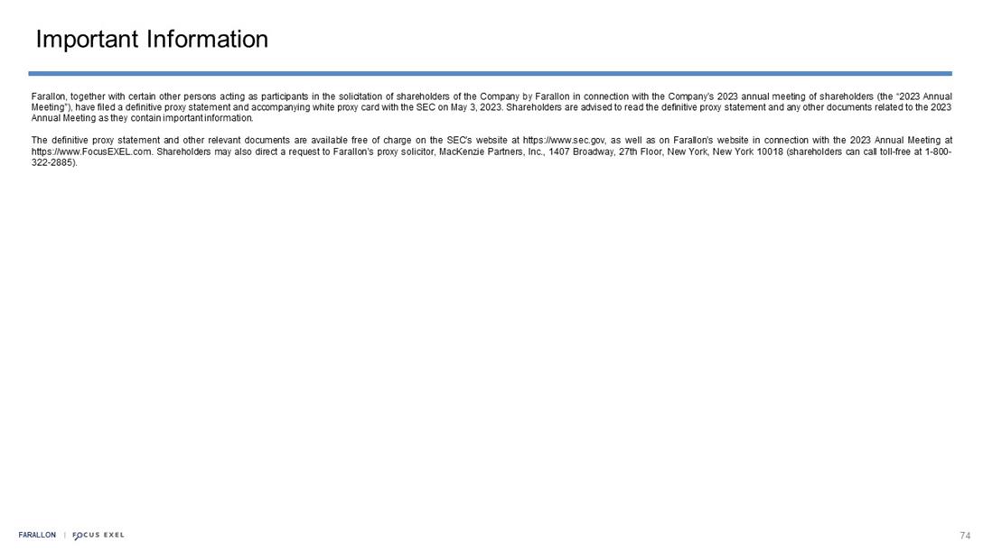 FARALLON | Important Information 74 Farallon, together with certain other persons acting as participants in the solicitation of shareholders of the Company by Farallon in connection with the Company’s 2023 annual meeting of shareholders (the “ 2023 Annual Meeting”), have filed a definitive proxy statement and accompanying white proxy card with the SEC on May 3 , 2023 . Shareholders are advised to read the definitive proxy statement and any other documents related to the 2023 Annual Meeting as they contain important information . The definitive proxy statement and other relevant documents are available free of charge on the SEC’s website at https : //www . sec . gov, as well as on Farallon’s website in connection with the 2023 Annual Meeting at https : //www . FocusEXEL . com . Shareholders may also direct a request to Farallon’s proxy solicitor, MacKenzie Partners, Inc . , 1407 Broadway, 27 th Floor, New York, New York 10018 (shareholders can call toll - free at 1 - 800 - 322 - 2885 ) .