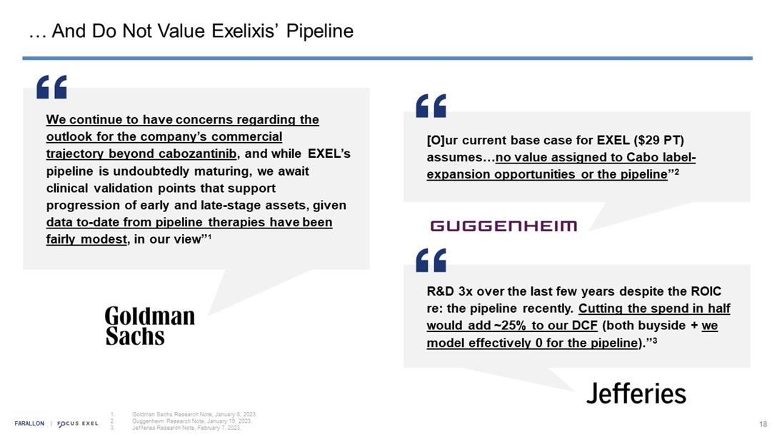 FARALLON | … And Do Not Value Exelixis’ Pipeline 18 [O]ur current base case for EXEL ($29 PT) assumes… no value assigned to Cabo label - expansion opportunities or the pipeline ” 2 R&D 3x over the last few years despite the ROIC re: the pipeline recently. Cutting the spend in half would add ~25% to our DCF (both buyside + we model effectively 0 for the pipeline ).” 3 We continue to have concerns regarding the outlook for the company’s commercial trajectory beyond cabozantinib , and while EXEL’s pipeline is undoubtedly maturing, we await clinical validation points that support progression of early and late - stage assets, given data to - date from pipeline therapies have been fairly modest , in our view” ¹ 1. Goldman Sachs Research Note, January 8, 2023. 2. Guggenheim Research Note, January 19, 2023. 3. Jefferies Research Note, February 7, 2023.