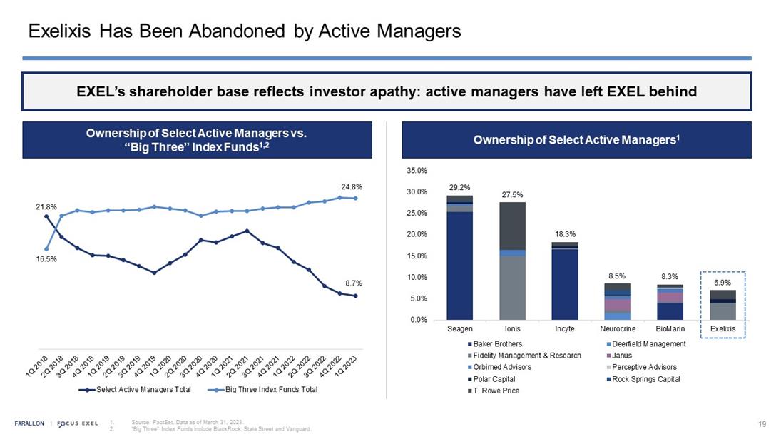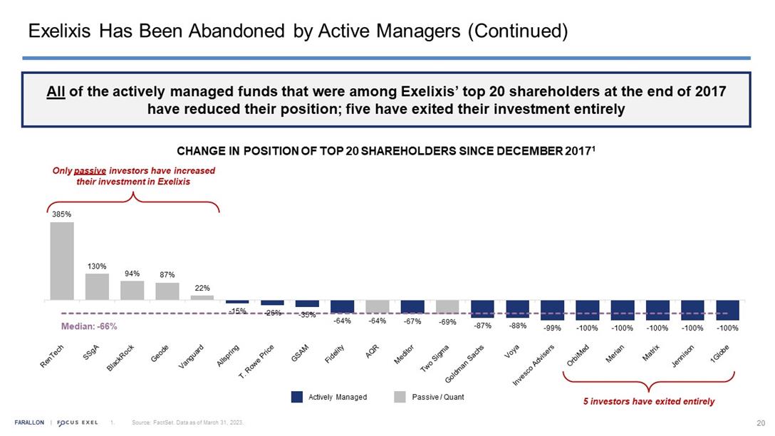FARALLON | Exelixis Has Been Abandoned by Active Managers 19 1. Source: FactSet. Data as of March 31, 2023. 2. “Big Three” Index Funds include BlackRock, State Street and Vanguard. 21.8% 8.7% 16.5% 24.8% Select Active Managers Total Big Three Index Funds Total 29.2% 27.5% 18.3% 8.5% 8.3% 6.9% 0.0% 5.0% 10.0% 15.0% 20.0% 25.0% 30.0% 35.0% Seagen Ionis Incyte Neurocrine BioMarin Exelixis Baker Brothers Deerfield Management Fidelity Management & Research Janus Orbimed Advisors Perceptive Advisors Polar Capital Rock Springs Capital T. Rowe Price Ownership of Select Active Managers vs. “Big Three” Index Funds 1,2 Ownership of Select Active Managers 1 EXEL’s shareholder base reflects investor apathy: active managers have left EXEL behind