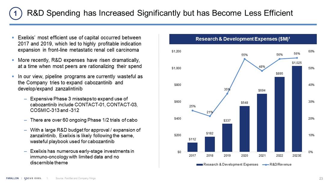 FARALLON | We Believe Exelixis ’ Underperformance and Low Valuation Have Known Causes 22 22 Inefficient and unfocused R&D ▪ Exelixis ’ R&D spending has increased significantly, but has not delivered strong returns ▪ Exelixis ’ pipeline appears unfocused, without a clear theme or unifying principle Suboptimal capital allocation and an inefficient balance sheet ▪ The Company’s cash and securities position is excessive Inability to deliver on stated targets ▪ Exelixis has disappointed investors by failing to meet management’s long - term targets for cabozantinib Poorly designed compensation program ▪ CEO compensation has been increasing, despite poor performance ▪ The compensation program, which uses an excessive number of metrics, reflects a lack of focus Poor corporate culture ▪ Employees appear to be frustrated with the Company’s leadership and direction 1 2 3 5 4