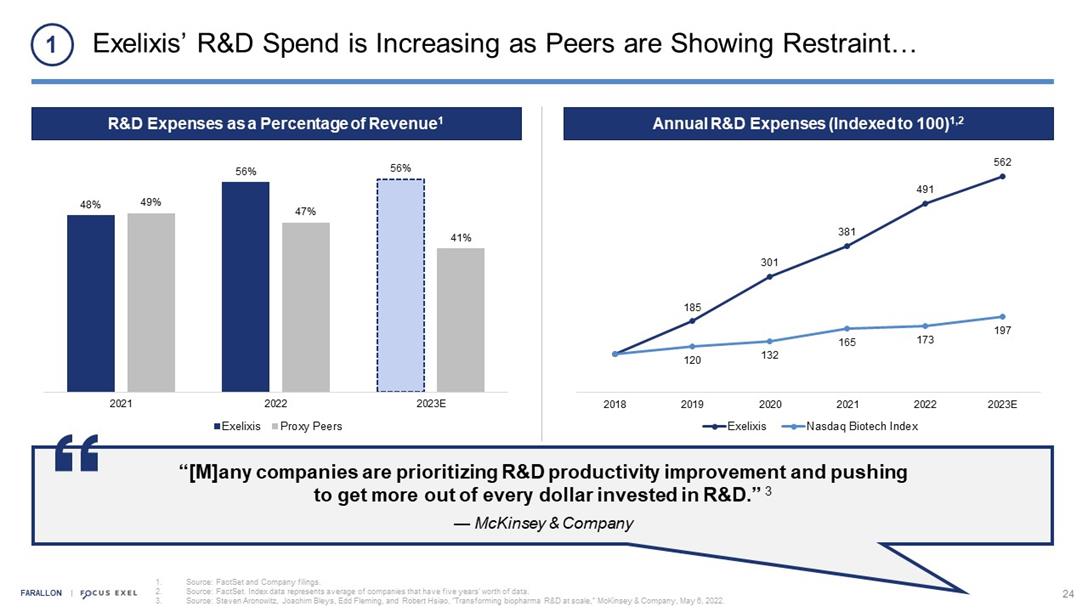FARALLON | R&D Spending has Increased Significantly but has Become Less Efficient 23 1. Source: FactSet and Company filings. ▪ Exelixis ’ most efficient use of capital occurred between 2017 and 2019, which led to highly profitable indication expansion in front - line metastatic renal cell carcinoma ▪ More recently, R&D expenses have risen dramatically, at a time when most peers are rationalizing their spend ▪ In our view, pipeline programs are currently wasteful as the Company tries to expand cabozantinib and develop/expand zanzalintinib – Expensive Phase 3 missteps to expand use of cabozantinib include CONTACT - 01, CONTACT - 03, COSMIC - 313 and - 312 – There are over 60 ongoing Phase 1/2 trials of cabo – With a large R&D budget for approval / expansion of zanzalintinib, Exelixis is likely following the same, wasteful playbook used for cabozantinib – Exelixis has numerous early - stage investments in immuno - oncology with limited data and no discernible theme $112 $182 $337 $548 $694 $895 $1,025 25% 21% 35% 55% 48% 56% 56% 0% 10% 20% 30% 40% 50% 60% $0 $200 $400 $600 $800 $1,000 $1,200 2017 2018 2019 2020 2021 2022 2023E Research & Development Expenses R&D/Revenue Research & Development Expenses ($M) 1 1