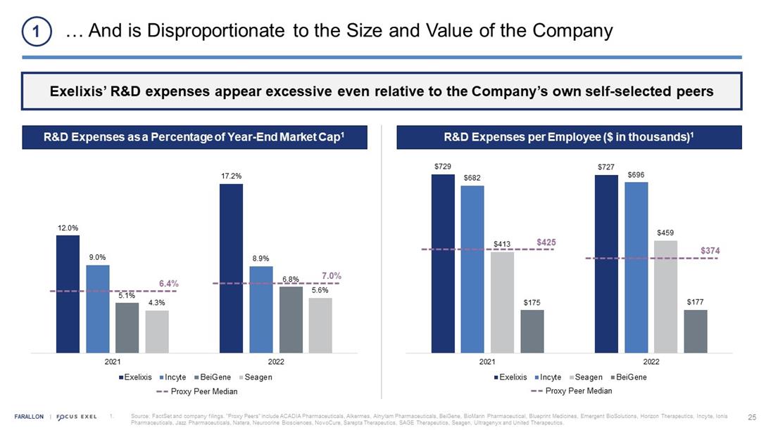 FARALLON | Exelixis ’ R&D Spend is Increasing as Peers are Showing Restraint… 24 1. Source: FactSet and Company filings. 2. Source: FactSet. Index data represents average of companies that have five years’ worth of data. 3. Source: Steven Aronowitz , Joachim Bleys , Edd Fleming, and Robert Hsiao, “Transforming biopharma R&D at scale,” McKinsey & Company, May 6, 2022. R&D Expenses as a Percentage of Revenue 1 48% 56% 56% 49% 47% 41% 2021 2022 2023E Exelixis Proxy Peers Annual R&D Expenses (Indexed to 100) 1,2 185 301 381 491 562 120 132 165 173 197 2018 2019 2020 2021 2022 2023E Exelixis Nasdaq Biotech Index 1 “[M]any companies are prioritizing R&D productivity improvement and pushing to get more out of every dollar invested in R&D.” 3 — McKinsey & Company