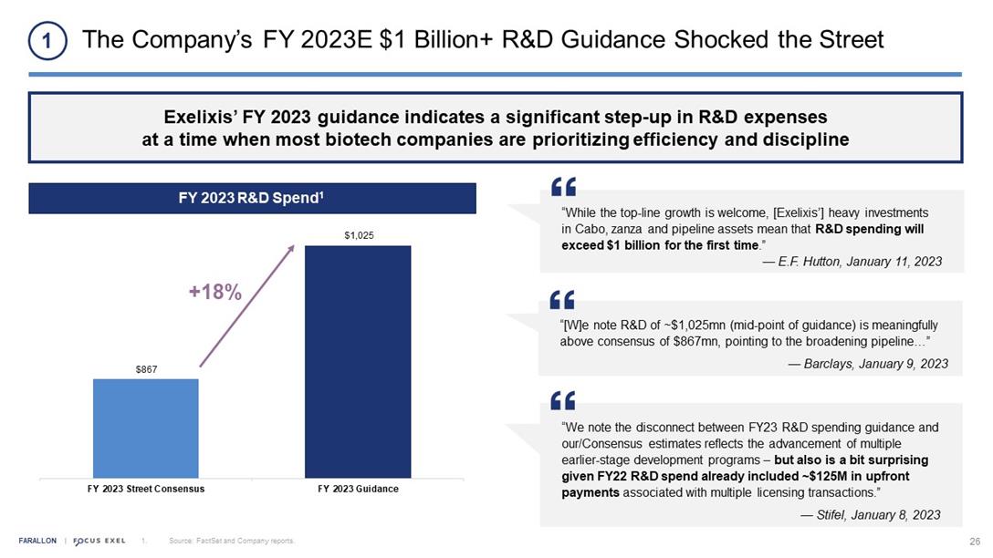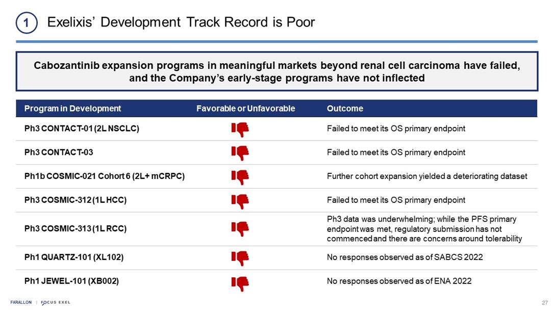 FARALLON | $867 $1,025 FY 2023 Street Consensus FY 2023 Guidance The Company’s FY 2023E $1 Billion+ R&D Guidance Shocked the Street 26 1. Source: FactSet and Company reports. +18% FY 2023 R&D Spend 1 1 Exelixis ’ FY 2023 guidance indicates a significant step - up in R&D expenses at a time when most biotech companies are prioritizing efficiency and discipline “While the top - line growth is welcome, [ Exelixis ’] heavy investments in Cabo, zanza and pipeline assets mean that R&D spending will exceed $1 billion for the first time .” — E.F. Hutton, January 11, 2023 “We note the disconnect between FY23 R&D spending guidance and our/Consensus estimates reflects the advancement of multiple earlier - stage development programs – but also is a bit surprising given FY22 R&D spend already included ~$125M in upfront payments associated with multiple licensing transactions.” — Stifel, January 8, 2023 “[W]e note R&D of ~$1,025mn (mid - point of guidance) is meaningfully above consensus of $867mn, pointing to the broadening pipeline…” — Barclays, January 9, 2023