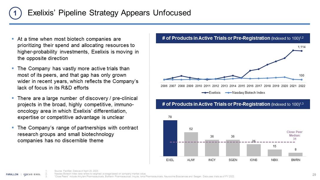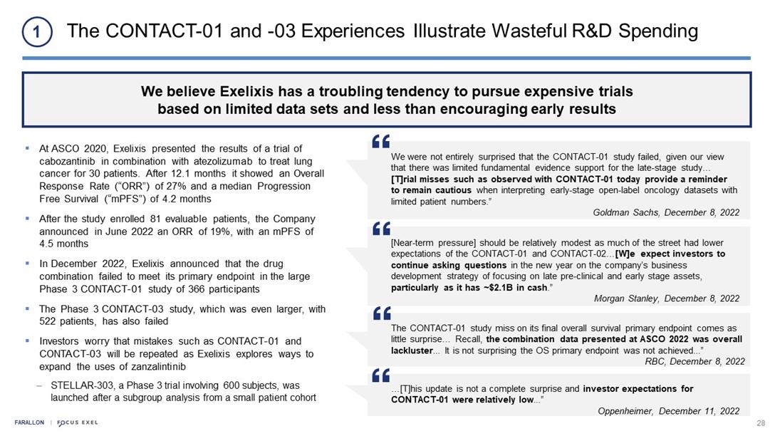 FARALLON | ▪ At ASCO 2020, Exelixis presented the results of a trial of cabozantinib in combination with atezolizumab to treat lung cancer for 30 patients. After 12.1 months it showed an Overall Response Rate (“ORR”) of 27% and a median Progression Free Survival (“mPFS”) of 4.2 months ▪ After the study enrolled 81 evaluable patients, the Company announced in June 2022 an ORR of 19%, with an mPFS of 4.5 months ▪ In December 2022, Exelixis announced that the drug combination failed to meet its primary endpoint in the large Phase 3 CONTACT - 01 study of 366 participants ▪ The Phase 3 CONTACT - 03 study, which was even larger, with 522 patients, has also failed ▪ Investors worry that mistakes such as CONTACT - 01 and CONTACT - 03 will be repeated as Exelixis explores ways to expand the uses of zanzalintinib – STELLAR - 303, a Phase 3 trial involving 600 subjects, was launched after a subgroup analysis from a small patient cohort The CONTACT - 01 and - 03 Experiences Illustrate Wasteful R&D Spending 28 We were not entirely surprised that the CONTACT - 01 study failed, given our view that there was limited fundamental evidence support for the late - stage study… [T]rial misses such as observed with CONTACT - 01 today provide a reminder to remain cautious when interpreting early - stage open - label oncology datasets with limited patient numbers.” Goldman Sachs, December 8, 2022 [Near - term pressure] should be relatively modest as much of the street had lower expectations of the CONTACT - 01 and CONTACT - 02… [W]e expect investors to continue asking questions in the new year on the company’s business development strategy of focusing on late pre - clinical and early stage assets, particularly as it has ~$2.1B in cash .” Morgan Stanley, December 8, 2022 The CONTACT - 01 study miss on its final overall survival primary endpoint comes as little surprise… Recall, the combination data presented at ASCO 2022 was overall lackluster ... It is not surprising the OS primary endpoint was not achieved...” RBC, December 8, 2022 …[T]his update is not a complete surprise and investor expectations for CONTACT - 01 were relatively low ...” Oppenheimer, December 11, 2022 1 We believe Exelixis has a troubling tendency to pursue expensive trials based on limited data sets and less than encouraging early results