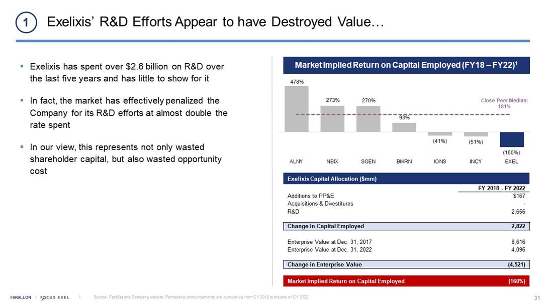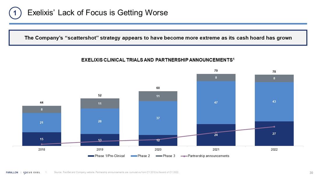 FARALLON | Exelixis’ Lack of Focus is Getting Worse 30 1. Source: FactSet and Company website. Partnership announcements are cumulative from CY 2018 to the end of CY 2022. 15 13 12 24 27 21 28 37 47 43 8 11 11 8 8 44 52 60 79 78 2018 2019 2020 2021 2022 Phase 1/Pre-Clinical Phase 2 Phase 3 Partnership announcements EXELIXIS CLINICAL TRIALS AND PARTNERSHIP ANNOUNCEMENTS 1 1 The Company’s “scattershot” strategy appears to have become more extreme as its cash hoard has grown