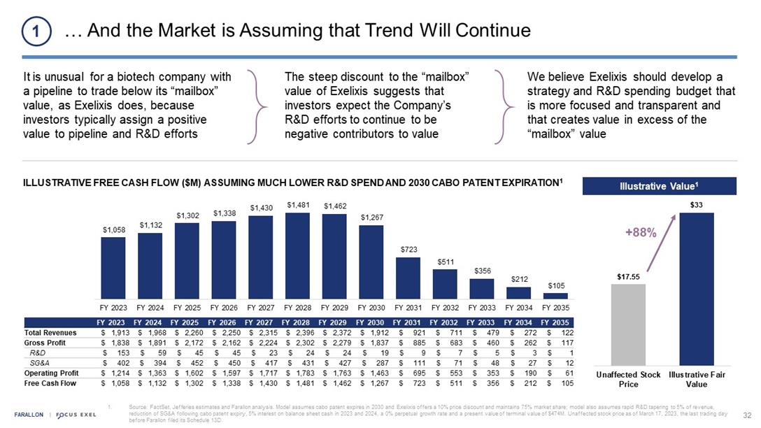 FARALLON | $17.55 $33 Unaffected Stock Price Illustrative Fair Value … And the Market is Assuming that Trend Will Continue 32 1. Source: FactSet, Jefferies estimates and Farallon analysis. Model assumes cabo patent expires in 2030 and Exelixis offers a 1 0% price discount and maintains 75% market share; model also assumes rapid R&D tapering to 5% of revenue, reduction of SG&A following cabo patent expiry, 5% interest on balance sheet cash in 2023 and 2024, a 0% perpetual growth rate and a present value of terminal v alue of $474M. Unaffected stock price as of March 17, 2023, the last trading day before Farallon filed its Schedule 13D. It is unusual for a biotech company with a pipeline to trade below its “mailbox” value, as Exelixis does, because investors typically assign a positive value to pipeline and R&D efforts FY 2023 FY 2024 FY 2025 FY 2026 FY 2027 FY 2028 FY 2029 FY 2030 FY 2031 FY 2032 FY 2033 FY 2034 FY 2035 Total Revenues $ 1,913 $ 1,968 $ 2,260 $ 2,250 $ 2,315 $ 2,396 $ 2,372 $ 1,912 $ 921 $ 711 $ 479 $ 272 $ 122 Gross Profit $ 1,838 $ 1,891 $ 2,172 $ 2,162 $ 2,224 $ 2,302 $ 2,279 $ 1,837 $ 885 $ 683 $ 460 $ 262 $ 117 R&D $ 153 $ 59 $ 45 $ 45 $ 23 $ 24 $ 24 $ 19 $ 9 $ 7 $ 5 $ 3 $ 1 SG&A $ 402 $ 394 $ 452 $ 450 $ 417 $ 431 $ 427 $ 287 $ 111 $ 71 $ 48 $ 27 $ 12 Operating Profit $ 1,214 $ 1,363 $ 1,602 $ 1,597 $ 1,717 $ 1,783 $ 1,763 $ 1,463 $ 695 $ 553 $ 353 $ 190 $ 61 Free Cash Flow $ 1,058 $ 1,132 $ 1,302 $ 1,338 $ 1,430 $ 1,481 $ 1,462 $ 1,267 $ 723 $ 511 $ 356 $ 212 $ 105 ILLUSTRATIVE FREE CASH FLOW ($M) ASSUMING MUCH LOWER R&D SPEND AND 2030 CABO PATENT EXPIRATION 1 Illustrative Value 1 +88% $1,058 $1,132 $1,302 $1,338 $1,430 $1,481 $1,462 $1,267 $723 $511 $356 $212 $105 FY 2023 FY 2024 FY 2025 FY 2026 FY 2027 FY 2028 FY 2029 FY 2030 FY 2031 FY 2032 FY 2033 FY 2034 FY 2035 1 The steep discount to the “mailbox” value of Exelixis suggests that investors expect the Company’s R&D efforts to continue to be negative contributors to value We believe Exelixis should develop a strategy and R&D spending budget that is more focused and transparent and that creates value in excess of the “mailbox” value