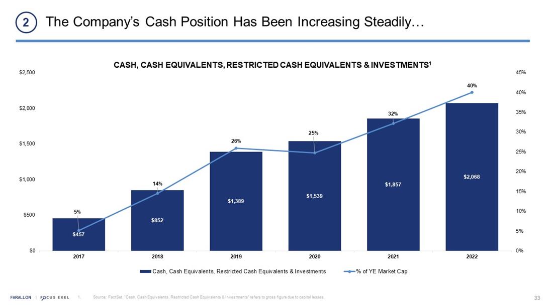 FARALLON | The Company’s Cash Position Has Been Increasing Steadily… 33 1. Source: FactSet. “Cash, Cash Equivalents, Restricted Cash Equivalents & Investments” refers to gross figure due to capital le ase s. $457 $852 $1,389 $1,539 $1,857 $2,068 5% 14% 26% 25% 32% 40% 0% 5% 10% 15% 20% 25% 30% 35% 40% 45% $0 $500 $1,000 $1,500 $2,000 $2,500 2017 2018 2019 2020 2021 2022 Cash, Cash Equivalents, Restricted Cash Equivalents & Investments % of YE Market Cap CASH, CASH EQUIVALENTS, RESTRICTED CASH EQUIVALENTS & INVESTMENTS 1 2