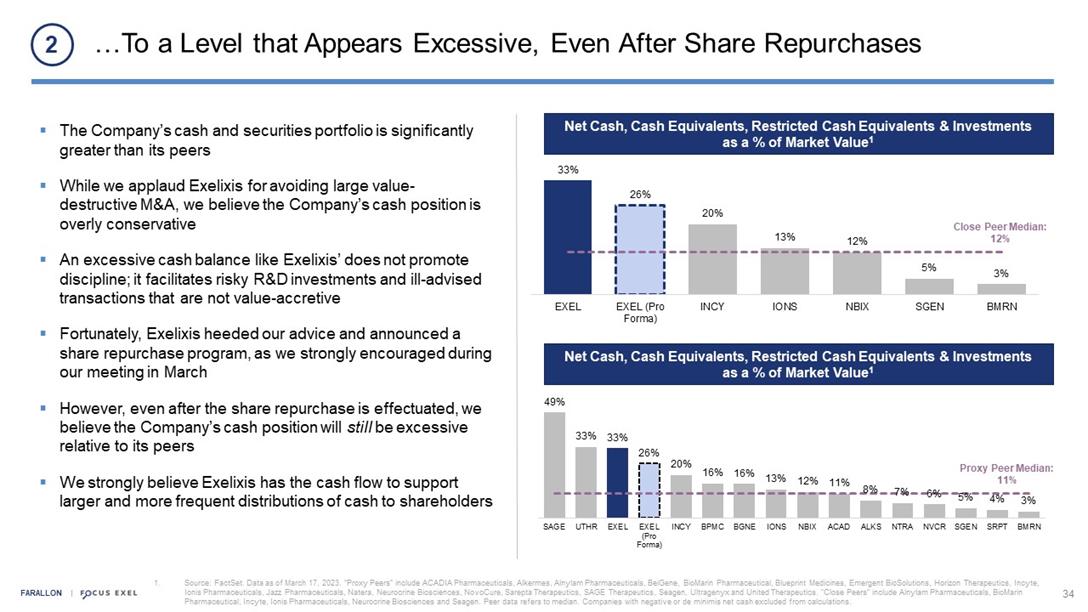 FARALLON | …To a Level that Appears Excessive, Even After Share Repurchases 34 ▪ The Company’s cash and securities portfolio is significantly greater than its peers ▪ While we applaud Exelixis for avoiding large value - destructive M&A, we believe the Company’s cash position is overly conservative ▪ An excessive cash balance like Exelixis’ does not promote discipline; it facilitates risky R&D investments and ill - advised transactions that are not value - accretive ▪ Fortunately, Exelixis heeded our advice and announced a share repurchase program, as we strongly encouraged during our meeting in March ▪ However, even after the share repurchase is effectuated, we believe the Company’s cash position will still be excessive relative to its peers ▪ We strongly believe Exelixis has the cash flow to support larger and more frequent distributions of cash to shareholders 1. Source: FactSet. Data as of March 17, 2023. “Proxy Peers” include ACADIA Pharmaceuticals, Alkermes, Alnylam Pharmaceuticals, BeiGene , BioMarin Pharmaceutical, Blueprint Medicines, Emergent BioSolutions, Horizon Therapeutics, Incyte, Ionis Pharmaceuticals, Jazz Pharmaceuticals, Natera , Neurocrine Biosciences, NovoCure , Sarepta Therapeutics, SAGE Therapeutics, Seagen , Ultragenyx and United Therapeutics. “Close Peers” include Alnylam Pharmaceuticals, BioMarin Pharmaceutical, Incyte, Ionis Pharmaceuticals, Neurocrine Biosciences and Seagen . Peer data refers to median. Companies with negative or de minimis net cash excluded from calculations. Net Cash, Cash Equivalents, Restricted Cash Equivalents & Investments as a % of Market Value 1 Net Cash, Cash Equivalents, Restricted Cash Equivalents & Investments as a % of Market Value 1 33% 26% 20% 13% 12% 5% 3% Close Peer Median: 12% EXEL EXEL (Pro Forma) INCY IONS NBIX SGEN BMRN 49% 33% 33% 26% 20% 16% 16% 13% 12% 11% 8% 7% 6% 5% 4% 3% Proxy Peer Median: 11% SAGE UTHR EXEL EXEL (Pro Forma) INCY BPMC BGNE IONS NBIX ACAD ALKS NTRA NVCR SGEN SRPT BMRN 2