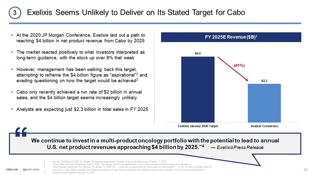 FARALLON | $4.0 $2.3 Exelixis January 2020 Target Analyst Consensus Exelixis Seems Unlikely to Deliver on Its Stated Target for Cabo 35 ▪ At the 2020 JP Morgan Conference, Exelixis laid out a path to reaching $4 billion in net product revenue from Cabo by 2025 ▪ The market reacted positively to what investors interpreted as long - term guidance, with the stock up over 8% that week ▪ However, management has been walking back this target, attempting to reframe the $4 billion figure as “aspirational” 2 and evading questioning on how the target would be achieved 3 ▪ Cabo only recently achieved a run rate of $2 billion in annual sales, and the $4 billion target seems increasingly unlikely ▪ Analysts are expecting just $2.3 billion in total sales in FY 2025 1. Source: FactSet and 2020 JP Morgan Conference presentation. Current analyst consensus as of March 17, 2023. 2. William Blair Growth Conference, June 9, 2020 (“So we put kind of that aspirational view of what success could look like out in January.”). 3. Credit Suisse Healthcare Conference, November 10, 2020 (“Q: …[H]ow do you get to that $4 billion - plus run rate by 2025?... A: So we went into great detail on the math. In fact, there is a slide in our deck and that kind of went through indication by indication, line by line, et cete ra. I won’t try to recapitulate that.”). 4. Exelixis Press Release, January 13, 2020. (41%) FY 2025E Revenue ($B) 1 3 We continue to invest in a multi - product oncology portfolio with the potential to lead to annual U.S. net product revenues approaching $4 billion by 2025.” 4 — Exelixis Press Release