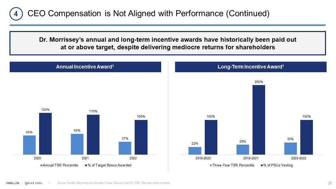 FARALLON | CEO Compensation is Not Aligned with Performance (Continued) 37 4 Annual Incentive Award 1 Long - Term Incentive Award 1 55% 60% 37% 120% 115% 100% 2020 2021 2022 Annual TSR Percentile % of Target Bonus Awarded 22% 29% 35% 100% 200% 100% 2018-2020 2019-2021 2020-2022 Three-Year TSR Percentile % of PSUs Vesting 1. Source: FactSet, Bloomberg and Company filings. Data as of April 30, 2022. Peer data refers to median. Dr. Morrissey’s annual and long - term incentive awards have historically been paid out at or above target, despite delivering mediocre returns for shareholders