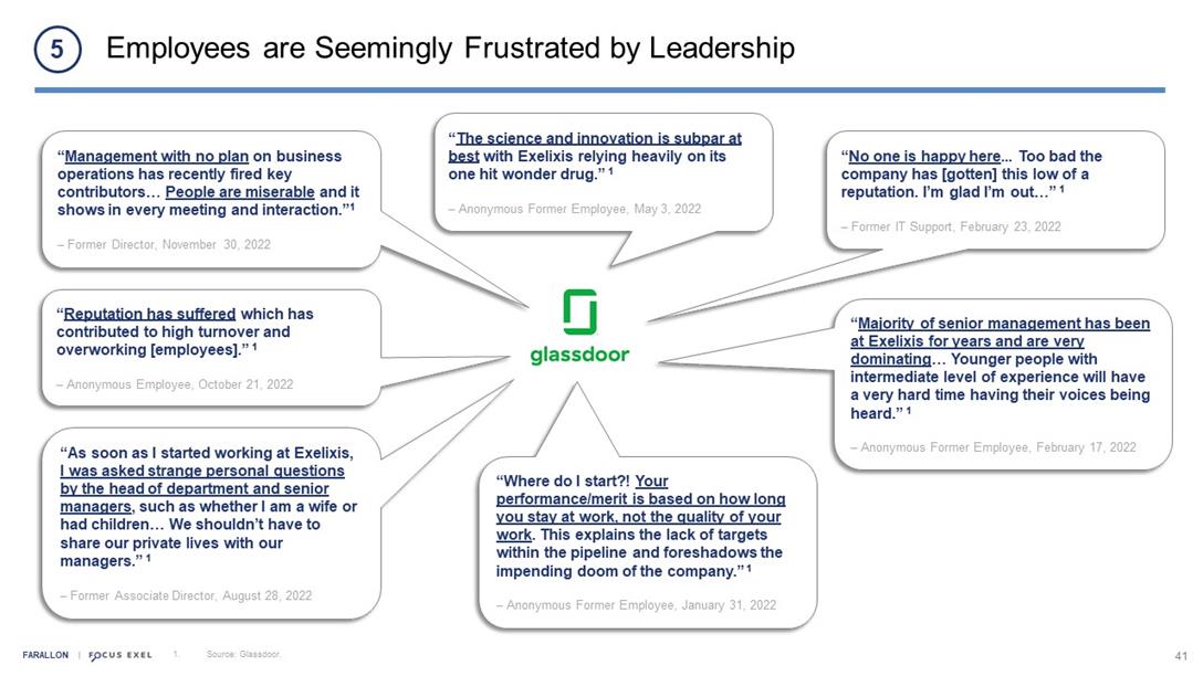 FARALLON | Employees are Seemingly Frustrated by Leadership 41 “ Management with no plan on business operations has recently fired key contributors… People are miserable and it shows in every meeting and interaction.” 1 – Former Director, November 30, 2022 “ Reputation has suffered which has contributed to high turnover and overworking [employees].” 1 – Anonymous Employee, October 21, 2022 “As soon as I started working at Exelixis, I was asked strange personal questions by the head of department and senior managers , such as whether I am a wife or had children… We shouldn’t have to share our private lives with our managers.” 1 – Former Associate Director, August 28, 2022 “ No one is happy here ... Too bad the company has [gotten] this low of a reputation. I’m glad I’m out…” 1 – Former IT Support, February 23, 2022 “ The science and innovation is subpar at best with Exelixis relying heavily on its one hit wonder drug.” 1 – Anonymous Former Employee, May 3, 2022 “ Majority of senior management has been at Exelixis for years and are very dominating … Younger people with intermediate level of experience will have a very hard time having their voices being heard.” 1 – Anonymous Former Employee, February 17, 2022 “Where do I start?! Your performance/merit is based on how long you stay at work, not the quality of your work . This explains the lack of targets within the pipeline and foreshadows the impending doom of the company.” 1 – Anonymous Former Employee, January 31, 2022 1. Source: Glassdoor. 5