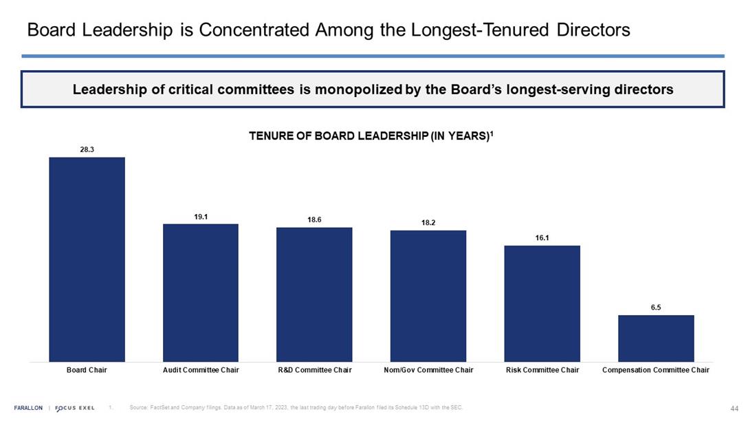 FARALLON | We Believe Exelixis ’ Board Remains Stale 43 ▪ The Exelixis Board currently has the tenth - highest average tenure in the entire Nasdaq Biotechnology Index (N = 273) and one of the highest among the Company’s peers ▪ The Board’s long tenure is inconsistent with governance best practices and the policies and perspectives of many of the Company’s shareholders and proxy advisory firms ▪ In our experience, Exelixis’ Board tenure is particularly high by biotechnology industry standards 1. Source: FactSet. Data as of March 17, 2023, the last trading day before Farallon filed its Schedule 13D with the SEC. 2. Pro forma data assumes all three of Farallon’s candidates are elected at the 2023 Annual Meeting. * Not standing for reelection at the 2023 Annual Meeting. Average Director Tenure (in Years) 1,2 Director Tenure (in Years) 1 14.7 10.0 Proxy Peer Median: 8.8 28.3 21.9 19.1 18.6 18.2 16.1 12.7 6.5 4.9 1.2 One Std. Dev. from Proxy Peer Median: 12.3