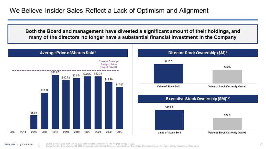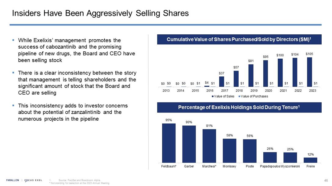 FARALLON | Insiders Have Been Aggressively Selling Shares 46 ▪ While Exelixis’ management promotes the success of cabozantinib and the promising pipeline of new drugs, the Board and CEO have been selling stock ▪ There is a clear inconsistency between the story that management is telling shareholders and the significant amount of stock that the Board and CEO are selling ▪ This inconsistency adds to investor concerns about the potential of zanzalintinib and the numerous projects in the pipeline Cumulative Value of Shares Purchased/Sold by Directors ($M) 1 Percentage of Exelixis Holdings Sold During Tenure 1 1. Source: FactSet and Boardroom Alpha. * Not standing for reelection at the 2023 Annual Meeting. $0 $0 $0 $4 $37 $57 $81 $95 $100 $104 $105 $0 $0 $1 $1 $1 $1 $1 $1 $1 $1 $1 2013 2014 2015 2016 2017 2018 2019 2020 2021 2022 2023 Value of Sales Value of Purchases 95% 90% 81% 58% 56% 26% 25% 12% Feldbaum* Garber Marchesi* Morrissey Poste Papadopoulos Wyszomierski Freire