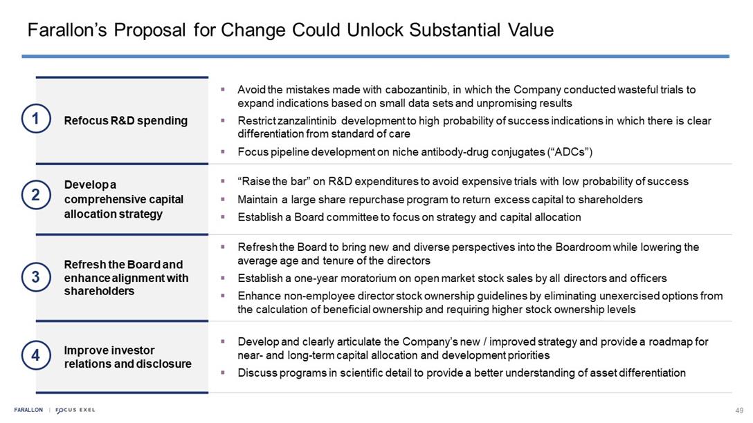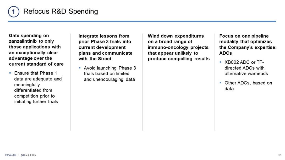 FARALLON | Farallon’s Proposal for Change Could Unlock Substantial Value 49 Refocus R&D spending ▪ Avoid the mistakes made with cabozantinib, in which the Company conducted w asteful trials to expand indications based on small data sets and unpromising results ▪ Restrict zanzalintinib development to high probability of success indications in which there is clear differentiation from standard of care ▪ Focus pipeline development on niche antibody - drug conjugates (“ADCs”) Develop a comprehensive capital allocation strategy ▪ “Raise the bar” on R&D expenditures to avoid expensive trials with low probability of success ▪ Maintain a large share repurchase program to return excess capital to shareholders ▪ Establish a Board committee to focus on strategy and capital allocation Refresh the Board and enhance alignment with shareholders ▪ Refresh the Board to bring new and diverse perspectives into the Boardroom while lowering the average age and tenure of the directors ▪ Establish a one - year moratorium on open market stock sales by all directors and officers ▪ Enhance non - employee director stock ownership guidelines by eliminating unexercised options from the calculation of beneficial ownership and requiring higher stock ownership levels Improve investor relations and disclosure ▪ Develop and clearly articulate the Company’s new / improved strategy and provide a roadmap for near - and long - term capital allocation and development priorities ▪ Discuss programs in scientific detail to provide a better understanding of asset differentiation 1 2 3 4