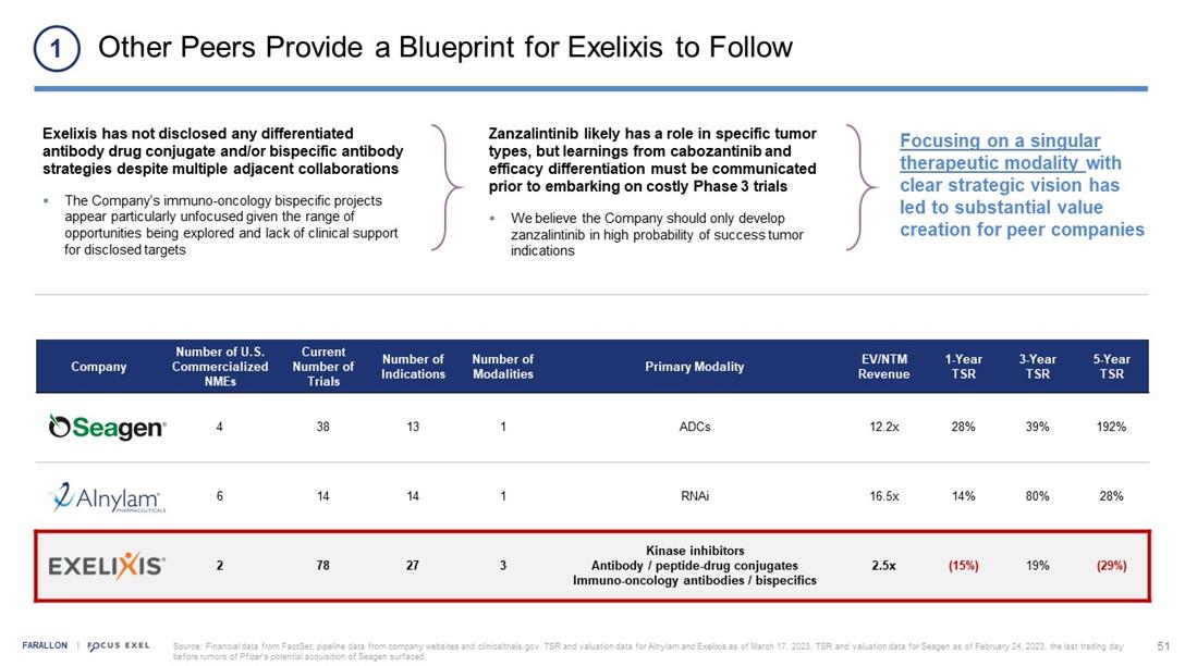 FARALLON | Other Peers Provide a Blueprint for Exelixis to Follow 51 Source: Financial data from FactSet; pipeline data from company websites and clinicaltrials.gov. TSR and valuation data for A lny lam and Exelixis as of March 17, 2023. TSR and valuation data for Seagen as of February 24, 2023, the last trading day before rumors of Pfizer’s potential acquisition of Seagen surfaced. Company Number of U.S. Commercialized NMEs Current Number of Trials Number of Indications Number of Modalities Primary Modality EV/NTM Revenue 1 - Year TSR 3 - Year TSR 5 - Year TSR 4 38 13 1 ADCs 12.2x 28% 39% 192% 6 14 14 1 RNAi 16.5x 14% 80% 28% 2 78 27 3 Kinase inhibitors Antibody / peptide - drug conjugates Immuno - oncology antibodies / bispecifics 2.5x (15%) 19% (29%) 1 Exelixis has not disclosed any differentiated antibody drug conjugate and/or bispecific antibody strategies despite multiple adjacent collaborations ▪ The Company’s immuno - oncology bispecific projects appear particularly unfocused given the range of opportunities being explored and lack of clinical support for disclosed targets Zanzalintinib likely has a role in specific tumor types, but learnings from cabozantinib and efficacy differentiation must be communicated prior to embarking on costly Phase 3 trials ▪ We believe the Company should only develop zanzalintinib in high probability of success tumor indications Focusing on a singular therapeutic modality with clear strategic vision has led to substantial value creation for peer companies