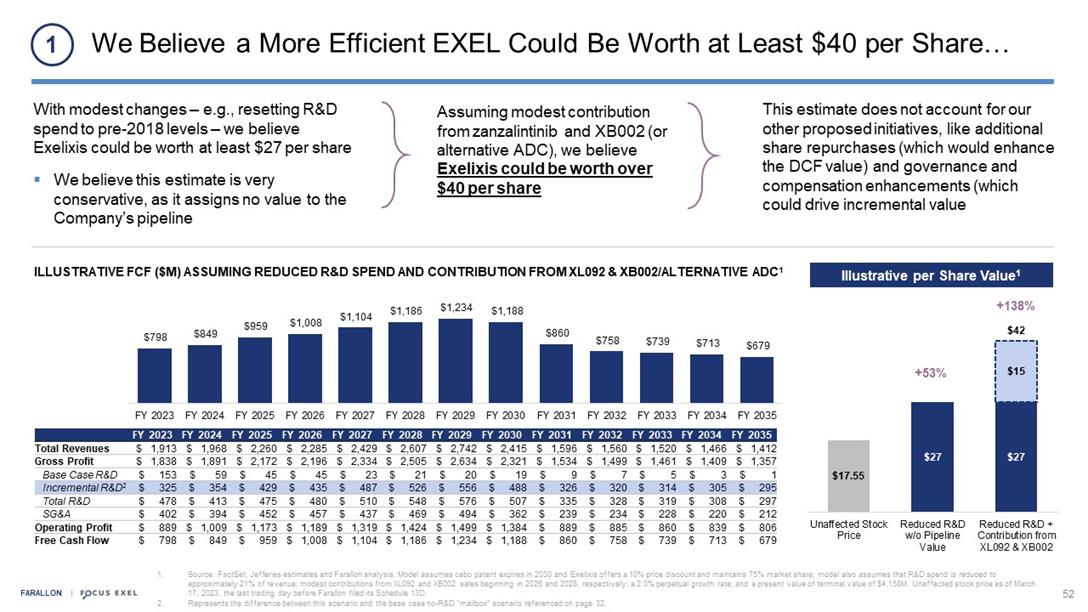 FARALLON | We Believe a More Efficient EXEL Could Be Worth at Least $40 per Share… 1. Source: FactSet, Jefferies estimates and Farallon analysis. Model assumes cabo patent expires in 2030 and Exelixis offers a 1 0% price discount and maintains 75% market share; model also assumes that R&D spend is reduced to approximately 21% of revenue; modest contributions from XL092 and XB002 sales beginning in 2026 and 2028, respectively; a 2.0 % p erpetual growth rate; and a present value of terminal value of $4,158M. Unaffected stock price as of March 17, 2023, the last trading day before Farallon filed its Schedule 13D. 2. Represents the difference between this scenario and the base case no - R&D “mailbox” scenario referenced on page 32. FY 2023 FY 2024 FY 2025 FY 2026 FY 2027 FY 2028 FY 2029 FY 2030 FY 2031 FY 2032 FY 2033 FY 2034 FY 2035 Total Revenues $ 1,913 $ 1,968 $ 2,260 $ 2,285 $ 2,429 $ 2,607 $ 2,742 $ 2,415 $ 1,596 $ 1,560 $ 1,520 $ 1,466 $ 1,412 Gross Profit $ 1,838 $ 1,891 $ 2,172 $ 2,196 $ 2,334 $ 2,505 $ 2,634 $ 2,321 $ 1,534 $ 1,499 $ 1,461 $ 1,409 $ 1,357 Base Case R&D $ 153 $ 59 $ 45 $ 45 $ 23 $ 21 $ 20 $ 19 $ 9 $ 7 $ 5 $ 3 $ 1 Incremental R&D 2 $ 325 $ 354 $ 429 $ 435 $ 487 $ 526 $ 556 $ 488 $ 326 $ 320 $ 314 $ 305 $ 295 Total R&D $ 478 $ 413 $ 475 $ 480 $ 510 $ 548 $ 576 $ 507 $ 335 $ 328 $ 319 $ 308 $ 297 SG&A $ 402 $ 394 $ 452 $ 457 $ 437 $ 469 $ 494 $ 362 $ 239 $ 234 $ 228 $ 220 $ 212 Operating Profit $ 889 $ 1,009 $ 1,173 $ 1,189 $ 1,319 $ 1,424 $ 1,499 $ 1,384 $ 889 $ 885 $ 860 $ 839 $ 806 Free Cash Flow $ 798 $ 849 $ 959 $ 1,008 $ 1,104 $ 1,186 $ 1,234 $ 1,188 $ 860 $ 758 $ 739 $ 713 $ 679 ILLUSTRATIVE FCF ($M) ASSUMING REDUCED R&D SPEND AND CONTRIBUTION FROM XL092 & XB002/ALTERNATIVE ADC 1 Illustrative per Share Value 1 +53% +138% 1 52 $798 $849 $959 $1,008 $1,104 $1,186 $1,234 $1,188 $860 $758 $739 $713 $679 FY 2023 FY 2024 FY 2025 FY 2026 FY 2027 FY 2028 FY 2029 FY 2030 FY 2031 FY 2032 FY 2033 FY 2034 FY 2035 $17.55 $27 $27 $15 $42 Unaffected Stock Price Reduced R&D w/o Pipeline Value Reduced R&D + Contribution from XL092 & XB002 With modest changes – e.g., resetting R&D spend to pre - 2018 levels – we believe Exelixis could be worth at least $27 per share ▪ We believe this estimate is very conservative, as it assigns no value to the Company’s pipeline Assuming modest contribution from zanzalintinib and XB002 (or alternative ADC), we believe Exelixis could be worth over $40 per share This estimate does not account for our other proposed initiatives, like additional share repurchases (which would enhance the DCF value) and governance and compensation enhancements (which could drive incremental value