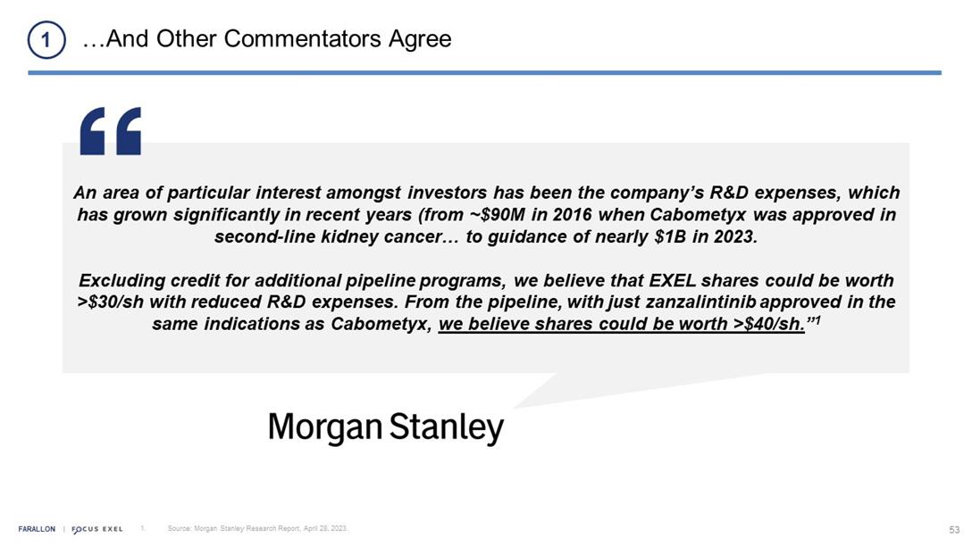 FARALLON | …And Other Commentators Agree 1 53 An area of particular interest amongst investors has been the company’s R&D expenses, which has grown significantly in recent years (from ~$90M in 2016 when Cabometyx was approved in second - line kidney cancer… to guidance of nearly $1B in 2023. Excluding credit for additional pipeline programs, we believe that EXEL shares could be worth >$30/ sh with reduced R&D expenses. From the pipeline, with just zanzalintinib approved in the same indications as Cabometyx , we believe shares could be worth >$40/sh. ” 1 1. Source: Morgan Stanley Research Report, April 28, 2023.
