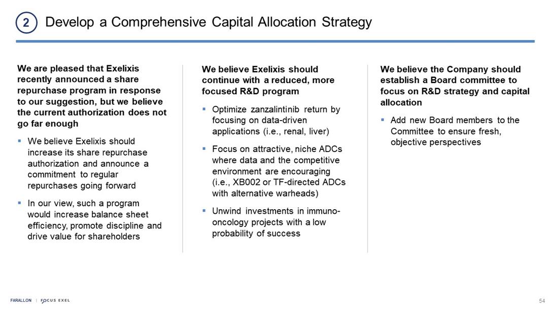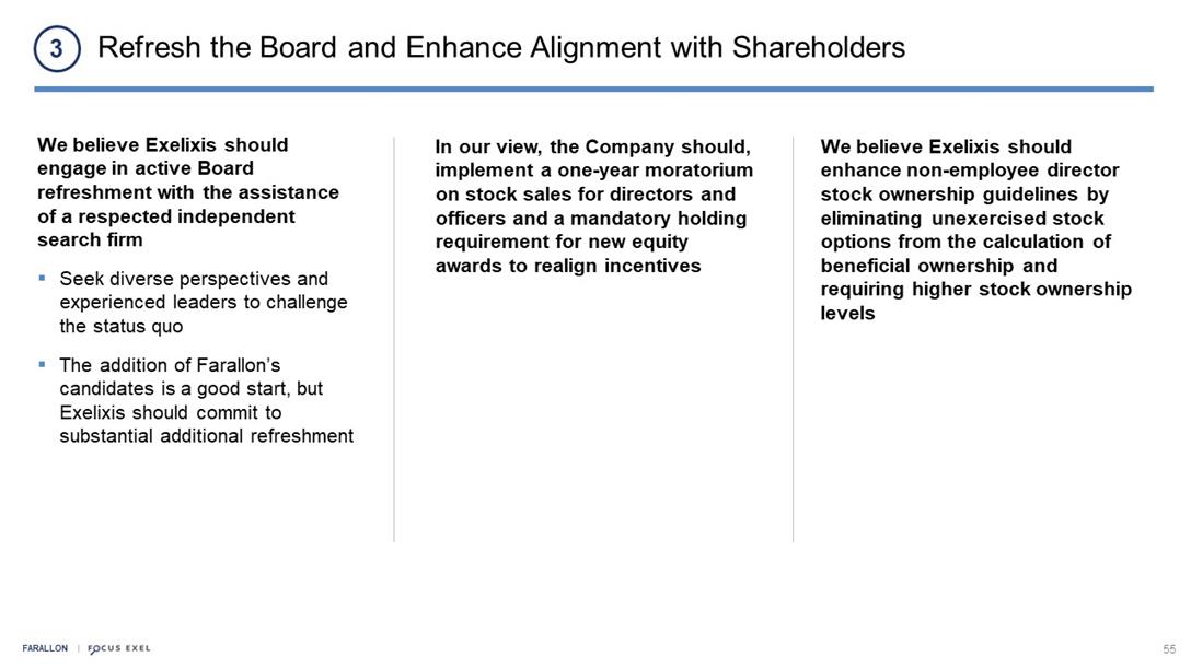 FARALLON | Develop a Comprehensive Capital Allocation Strategy 54 2 We are pleased that Exelixis recently announced a share repurchase program in response to our suggestion, but we believe the current authorization does not go far enough ▪ We believe Exelixis should increase its share repurchase authorization and announce a commitment to regular repurchases going forward ▪ In our view, such a program would increase balance sheet efficiency, promote discipline and drive value for shareholders We believe Exelixis should continue with a reduced, more focused R&D program ▪ Optimize zanzalintinib return by focusing on data - driven applications (i.e., renal, liver) ▪ Focus on attractive, niche ADCs where data and the competitive environment are encouraging (i.e., XB002 or TF - directed ADCs with alternative warheads) ▪ Unwind investments in immuno - oncology projects with a low probability of success We believe the Company should establish a Board committee to focus on R&D strategy and capital allocation ▪ Add new Board members to the Committee to ensure fresh, objective perspectives