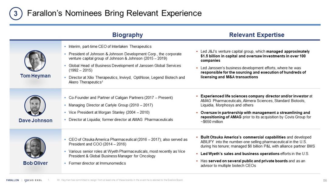 FARALLON | Farallon’s Nominees Bring Relevant Experience 56 3 Biography Relevant Expertise Tom Heyman ▪ Interim, part - time CEO of Interlaken Therapeutics ▪ President of Johnson & Johnson Development Corp., the corporate venture capital group of Johnson & Johnson (2015 – 2019) ▪ Global Head of Business Development of Janssen Global Services (1992 – 2015) ▪ Director at Xilio Therapeutics, Invivyd , OptiNose , Legend Biotech and Akero Therapeutics 1 ▪ Led J&J’s venture capital group, which managed approximately $1.5 billion in capital and oversaw investments in over 100 companies ▪ Led Janssen’s business development efforts, where he was responsible for the sourcing and execution of hundreds of licensing and M&A transactions Dave Johnson ▪ Co - Founder and Partner of Caligan Partners (2017 – Present) ▪ Managing Director at Carlyle Group (2010 – 2017) ▪ Vice President at Morgan Stanley (2004 – 2010) ▪ Director at Liquidia ; former director at AMAG Pharmaceuticals ▪ Experienced life sciences company director and/or investor at AMAG Pharmaceuticals, Alimera Sciences, Standard Biotools , Liquidia , Morphosys and others ▪ Oversaw in partnership with management a streamlining and repositioning of AMAG prior to its acquisition by Covis Group for ~$650 million Bob Oliver ▪ CEO of Otsuka America Pharmaceutical (2016 – 2017); also served as President and COO (2014 – 2016) ▪ Various senior roles at Wyeth Pharmaceuticals, most recently as Vice President & Global Business Manager for Oncology ▪ Former director at Immunomedics ▪ Built Otsuka America’s commercial capabilities and developed ABILIFY into the number - one selling pharmaceutical in the U.S. during his tenure; managed $6 billion P&L with alliance partner BMS ▪ Led Wyeth’s sales and business operations efforts in the U.S. ▪ Has served on several public and private boards and as an advisor to multiple biotech CEOs 1. Mr. Heyman has committed to resign from at least one of these boards in the event he is elected to the Exelixis Board.