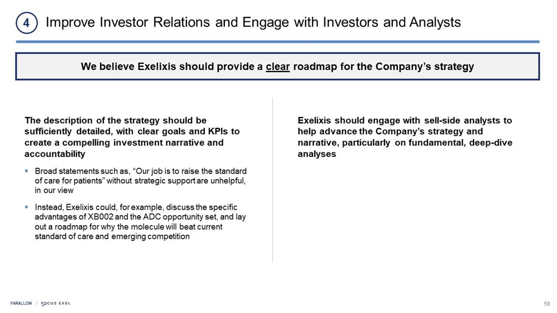 FARALLON | Improve Investor Relations and Engage with Investors and Analysts 58 4 We believe Exelixis should provide a clear roadmap for the Company’s strategy The description of the strategy should be sufficiently detailed, with clear goals and KPIs to create a compelling investment narrative and accountability ▪ Broad statements such as, “Our job is to raise the standard of care for patients” without strategic support are unhelpful, in our view ▪ Instead, Exelixis could, for example, discuss the specific advantages of XB002 and the ADC opportunity set, and lay out a roadmap for why the molecule will beat current standard of care and emerging competition Exelixis should engage with sell - side analysts to help advance the Company’s strategy and narrative, particularly on fundamental, deep - dive analyses