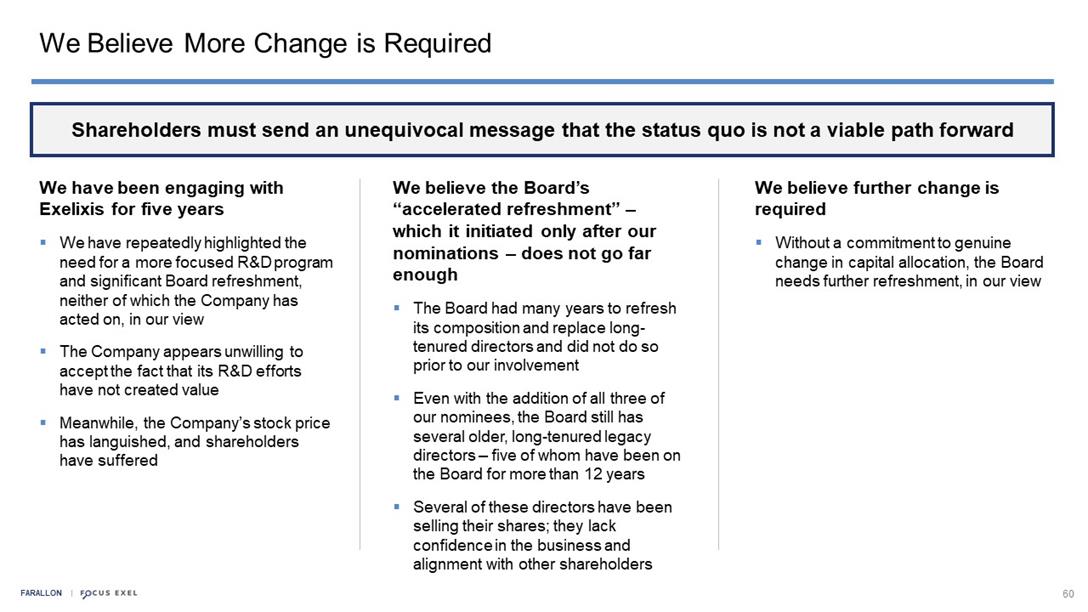 FARALLON | Shareholders Should Support Farallon’s Nominees to Drive Meaningful Change 61 We Believe Exelixis Has Underperformed; Meaningful Change Is Needed Shareholders Should Vote for Change by Supporting Our Candidates ▪ Despite its advantages, Exelixis has underperformed for many years — Exelixis has created little value over the near - and long - term, and the Company remains deeply undervalued relative to peers ▪ The Board has had more than enough time to address the Company’s underperformance and, in our view, has failed — Five of the directors standing for election this year have been on the Board for over a decade — The Board has been slow to act: slow to refresh itself, slow to return capital to shareholders and slow to develop a coherent strategy — Shareholders should not be fooled: Exelixis ’ recent Board “refreshment,” begrudging acceptance of Farallon’s candidates and modest share repurchase occurred only because Farallon forced these issues to the fore — Meanwhile, several directors have been aggressively selling shares; they do not appear to share our optimism that things will improve ▪ We believe significant value can be unlocked at Exelixis — In our view, the Company should focus its R&D efforts on high - probability - of - success indications and develop a clear capital allocation strategy — With modest changes, we believe a more efficient Exelixis could be worth at least $40 per share ▪ It is critical that shareholders support our candidates and provide them a mandate to advocate for change