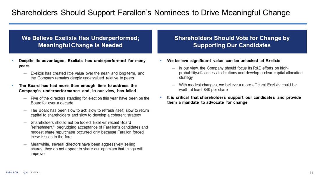 FARALLON | We Believe More Change is Required 60 We believe the Board’s “accelerated refreshment” – which it initiated only after our nominations – does not go far enough ▪ The Board had many years to refresh its composition and replace long - tenured directors and did not do so prior to our involvement ▪ Even with the addition of all three of our nominees, the Board still has several older, long - tenured legacy directors – five of whom have been on the Board for more than 12 years ▪ Several of these directors have been selling their shares; they lack confidence in the business and alignment with other shareholders We have been engaging with Exelixis for five years ▪ We have repeatedly highlighted the need for a more focused R&D program and significant Board refreshment, neither of which the Company has acted on, in our view ▪ The Company appears unwilling to accept the fact that its R&D efforts have not created value ▪ Meanwhile, the Company’s stock price has languished, and shareholders have suffered We believe further change is required ▪ Without a commitment to genuine change in capital allocation, the Board needs further refreshment, in our view Shareholders must send an unequivocal message that the status quo is not a viable path forward