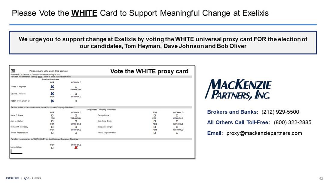 FARALLON | Please Vote the WHITE Card to Support Meaningful Change at Exelixis 62 Brokers and Banks: (212) 929 - 5500 All Others Call Toll - Free: (800) 322 - 2885 Email: proxy @mackenziepartners.com Vote the WHITE proxy card We urge you to support change at Exelixis by voting the WHITE universal proxy card FOR the election of our candidates, Tom Heyman, Dave Johnson and Bob Oliver